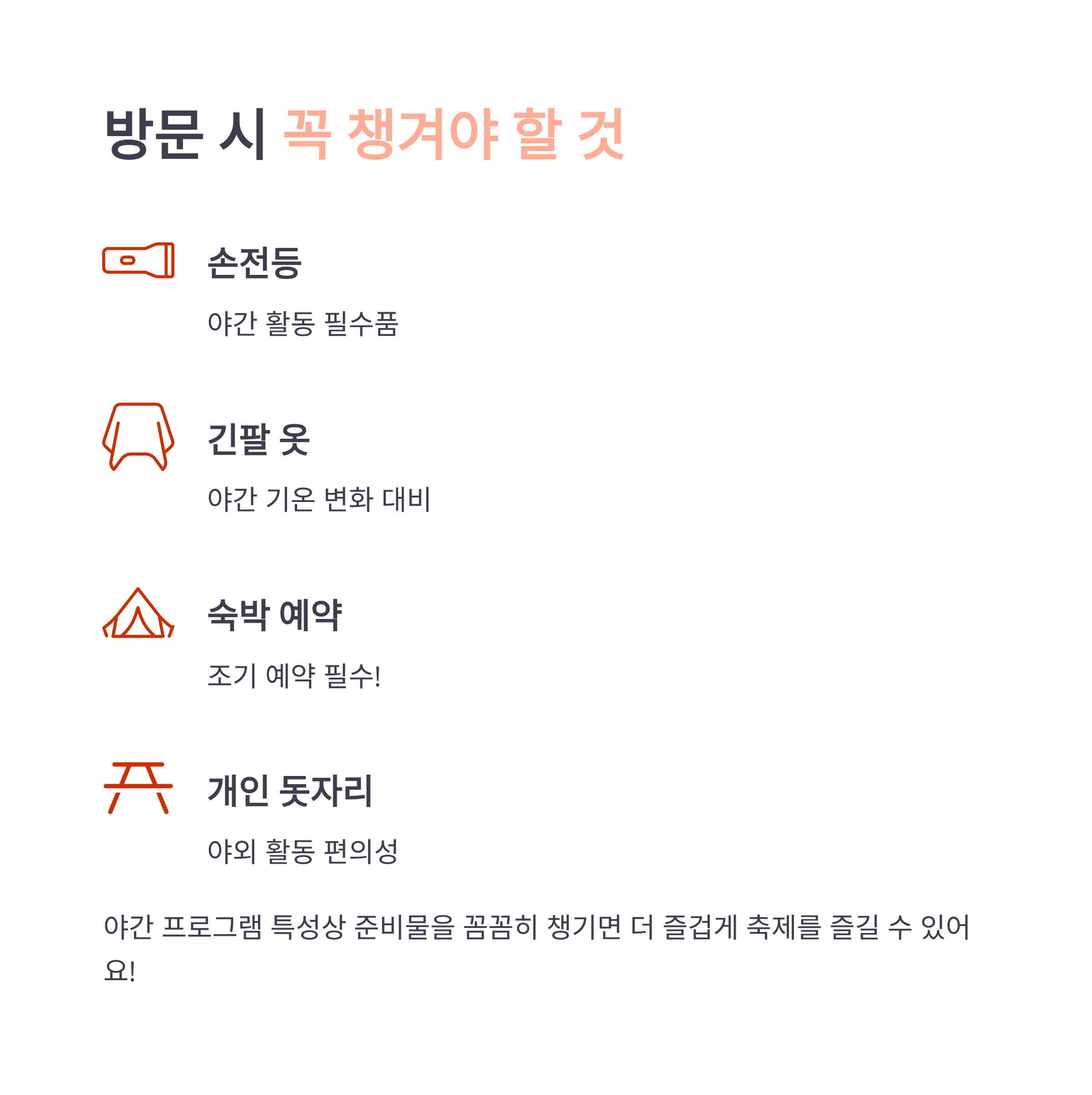 TIP: 사전예약, 숙소확보, 편한 복장, 손전등 지참은 필수!