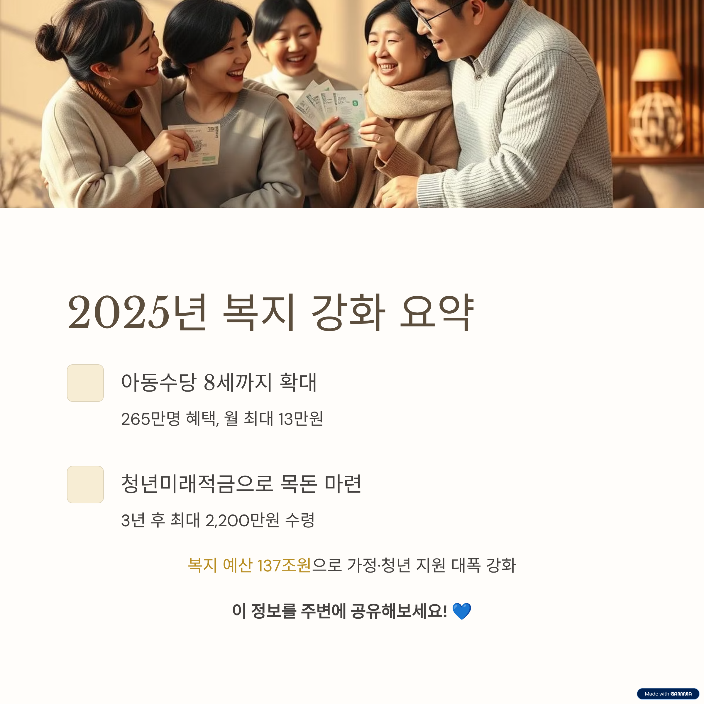 2025년부터 아동수당은 만 8세까지 확대되고, 청년들을 위한 청년미래적금 제도가 새롭게 시행됩니다.