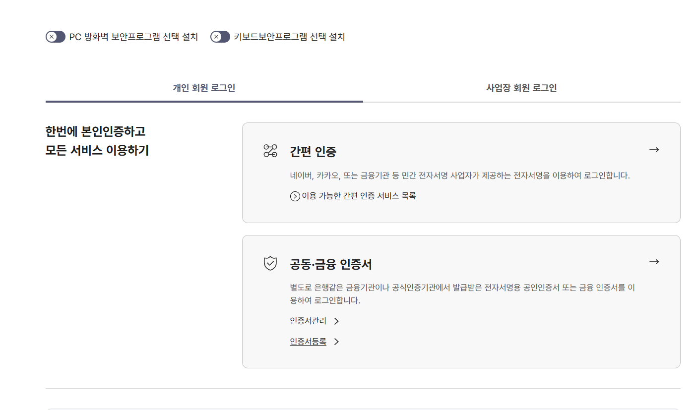 - 공동인증서 로그인 (또는 금융인증서)