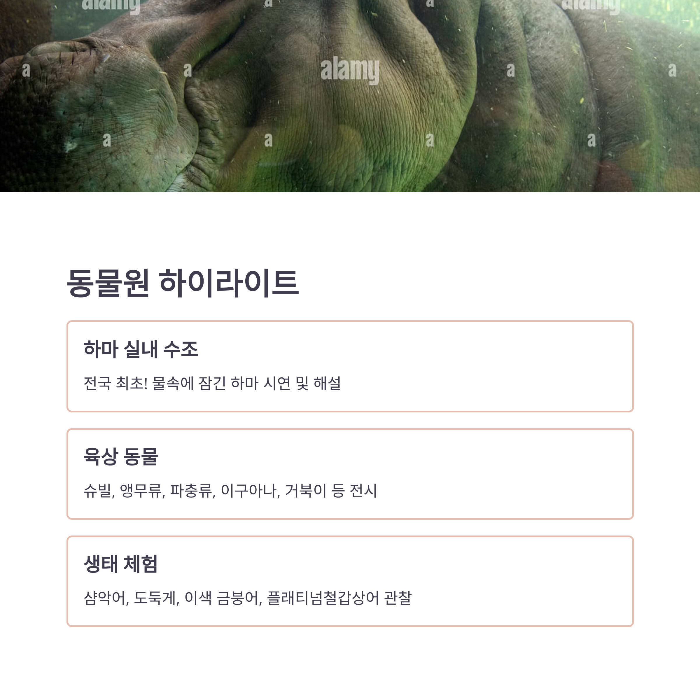 - 국내 최초 대형 하마 수중 전시관 → 실제 하마의 수중 행동 관찰 가능