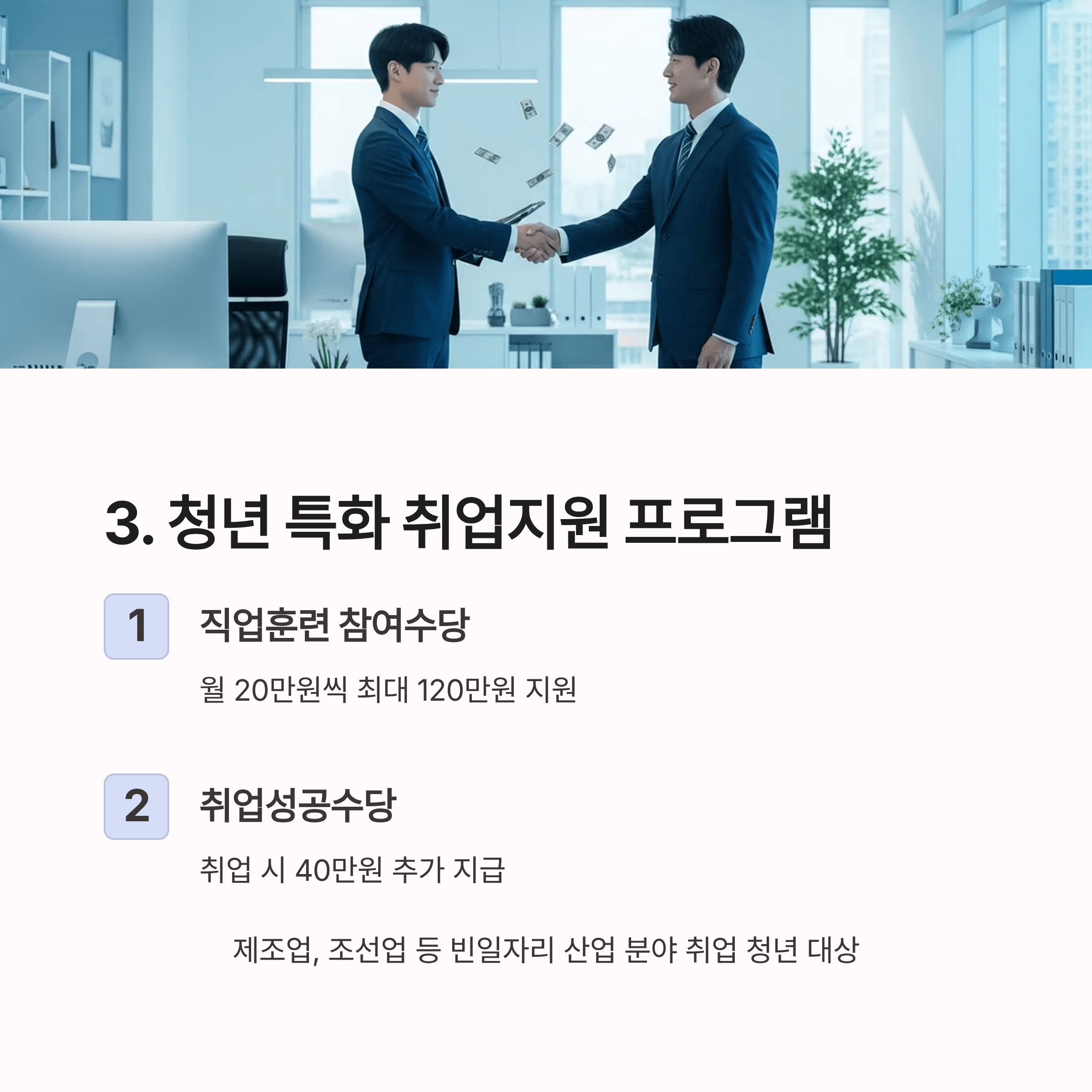 | 청년 특화 취업지원 | 빈일자리 업종 취업 청년 | 훈련수당 + 취업성공수당 | 최대 160만 원 |