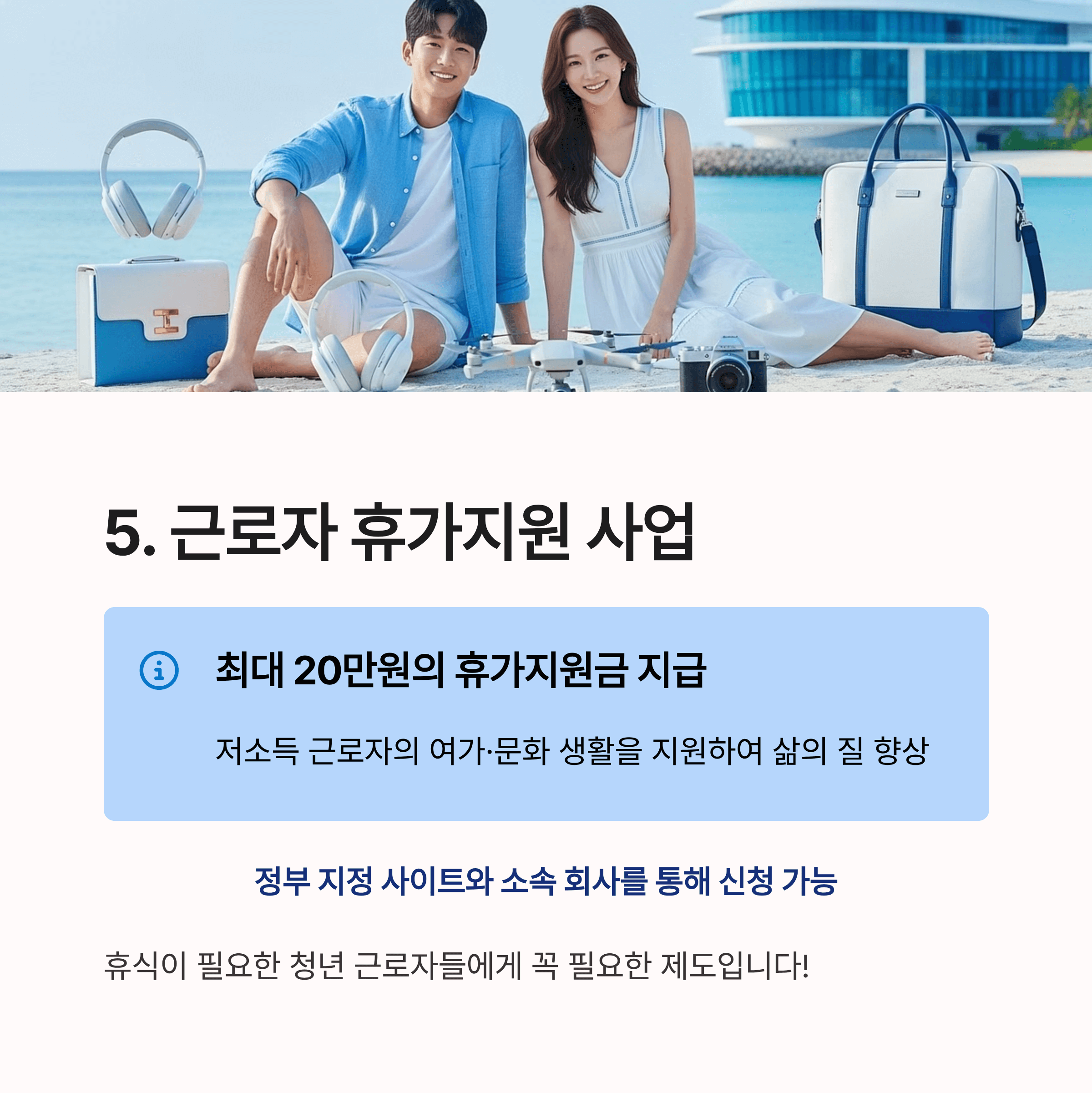 | 근로자 휴가지원 사업 | 청년 및 저소득 근로자 | 휴가비 지원 | 최대 20만 원 |