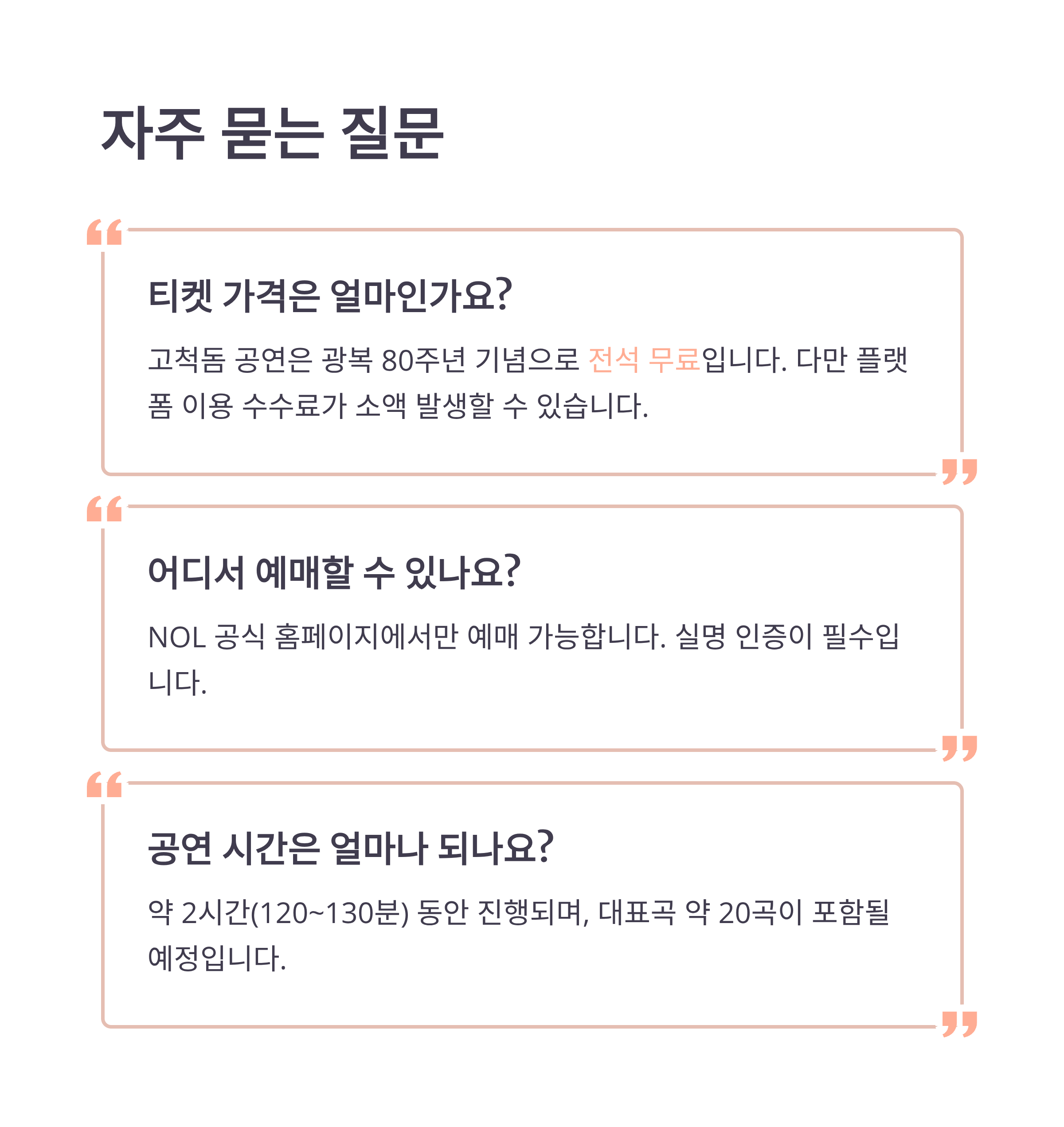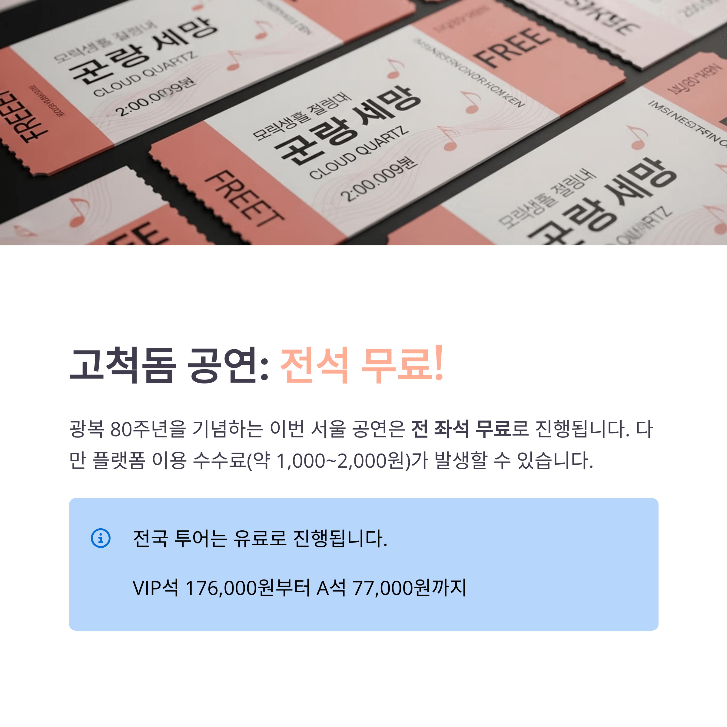A1. 고척돔 공연은 광복 80주년 기념으로 전석 무료입니다. 다만 플랫폼 이용 수수료가 소액 발생할 수 있습니다.