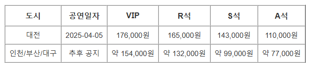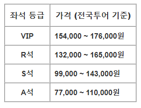 👉 전국 투어 공연은 별도의 유료 정책이 적용됩니다. (예: VIP 176,000원, R석 165,000원, S석 143,000원, A석 110,000원)