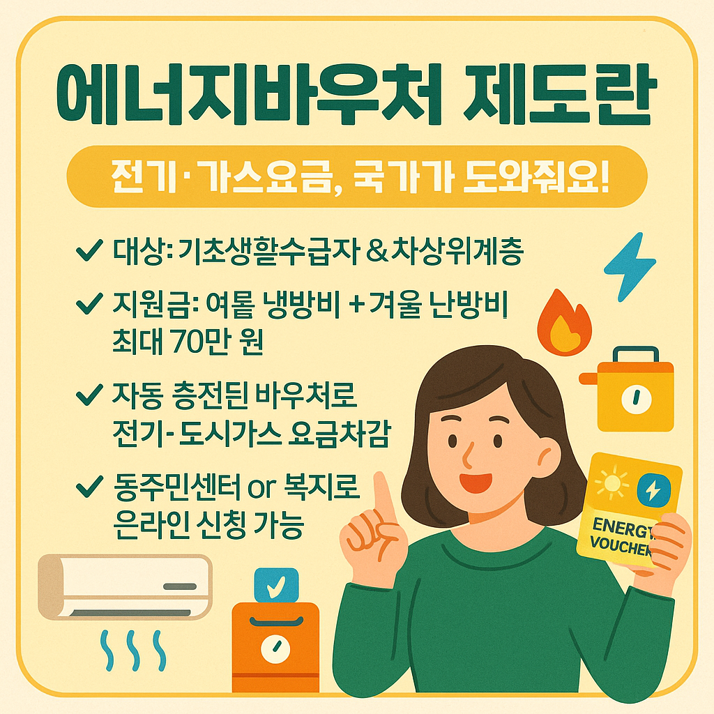 폭염도, 추위도 걱정 없이! 정부가 지원하는 '에너지 바우처 제도'로 냉방비와 난방비 부담을 줄여보세요.