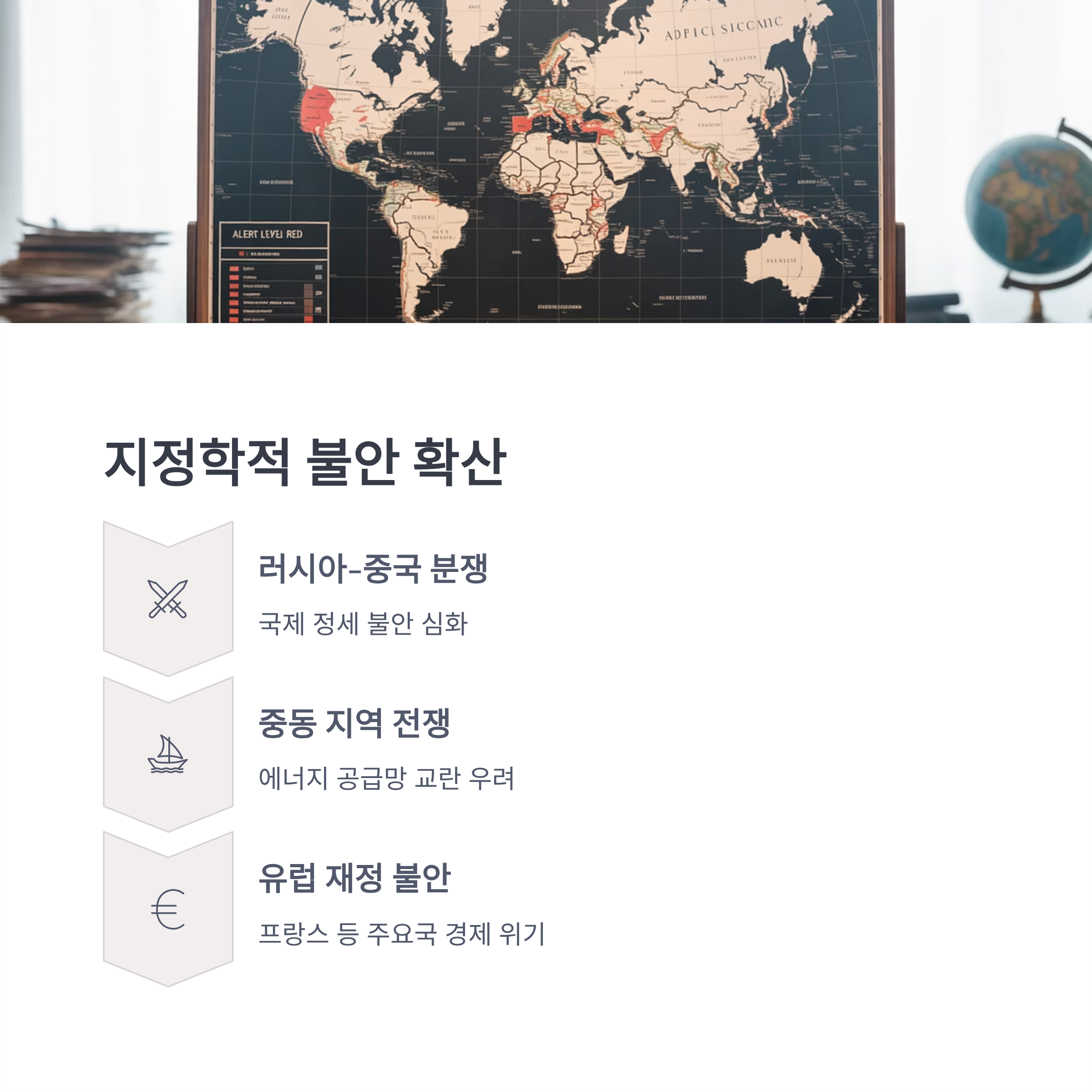 러시아-중국 간 분쟁, 중동 전쟁, 유럽 재정 불안(특히 프랑스) 등 지정학적 리스크가 시장 불안을 자극하고 있으며, 대표적 안전자산인 금에 대한 수요가 폭발적으로 증가하고 있습니다.