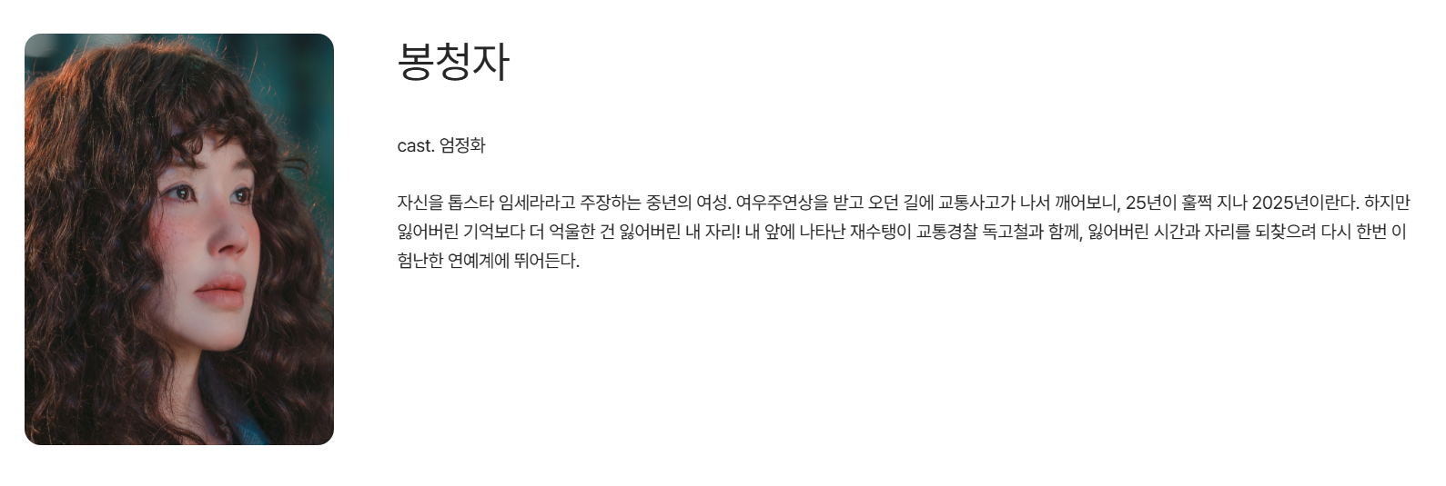 - 엄정화 (임세라/봉청자): 25년 만에 다시 무대로 돌아오려는 주인공, 과거의 영광을 되찾고자 하지만 현실의 벽과 마주합니다.