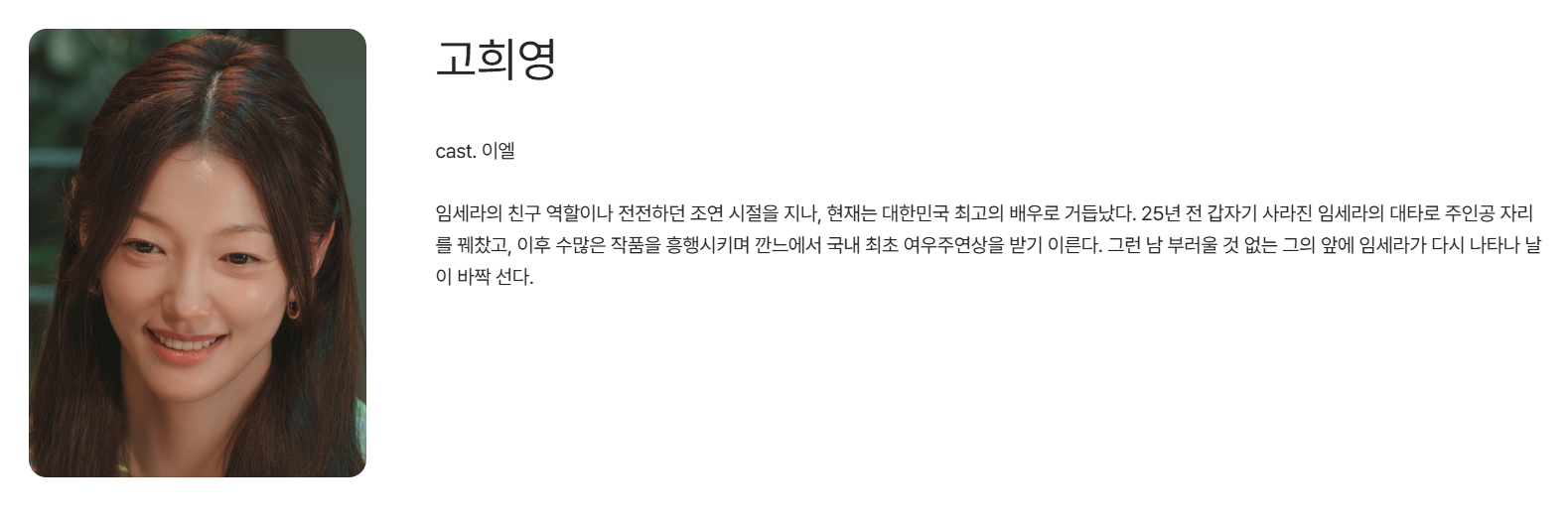 - 엘 (고희영): 임세라의 과거 라이벌이자 현재 톱스타, 과거와 현재가 교차하며 긴장감을 형성합니다.