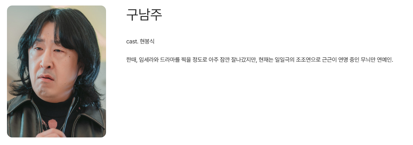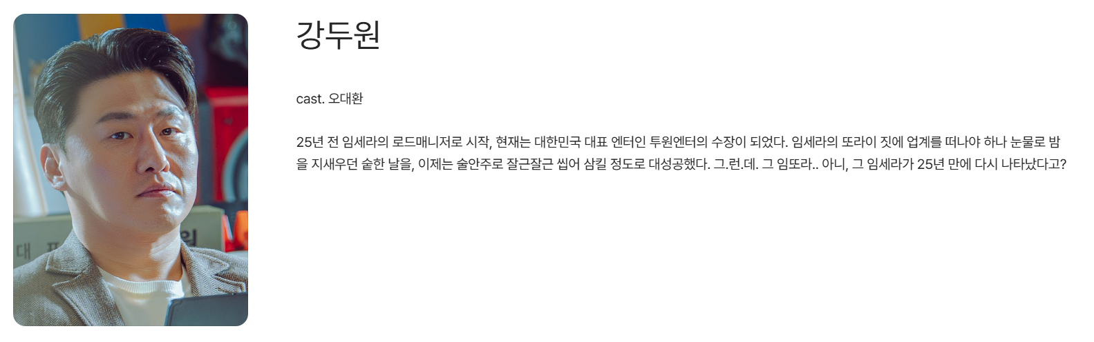 - 오대환 (강두원): 임세라의 옛 매니저 출신, 현재는 대형 기획사 대표로 변신한 캐릭터.
