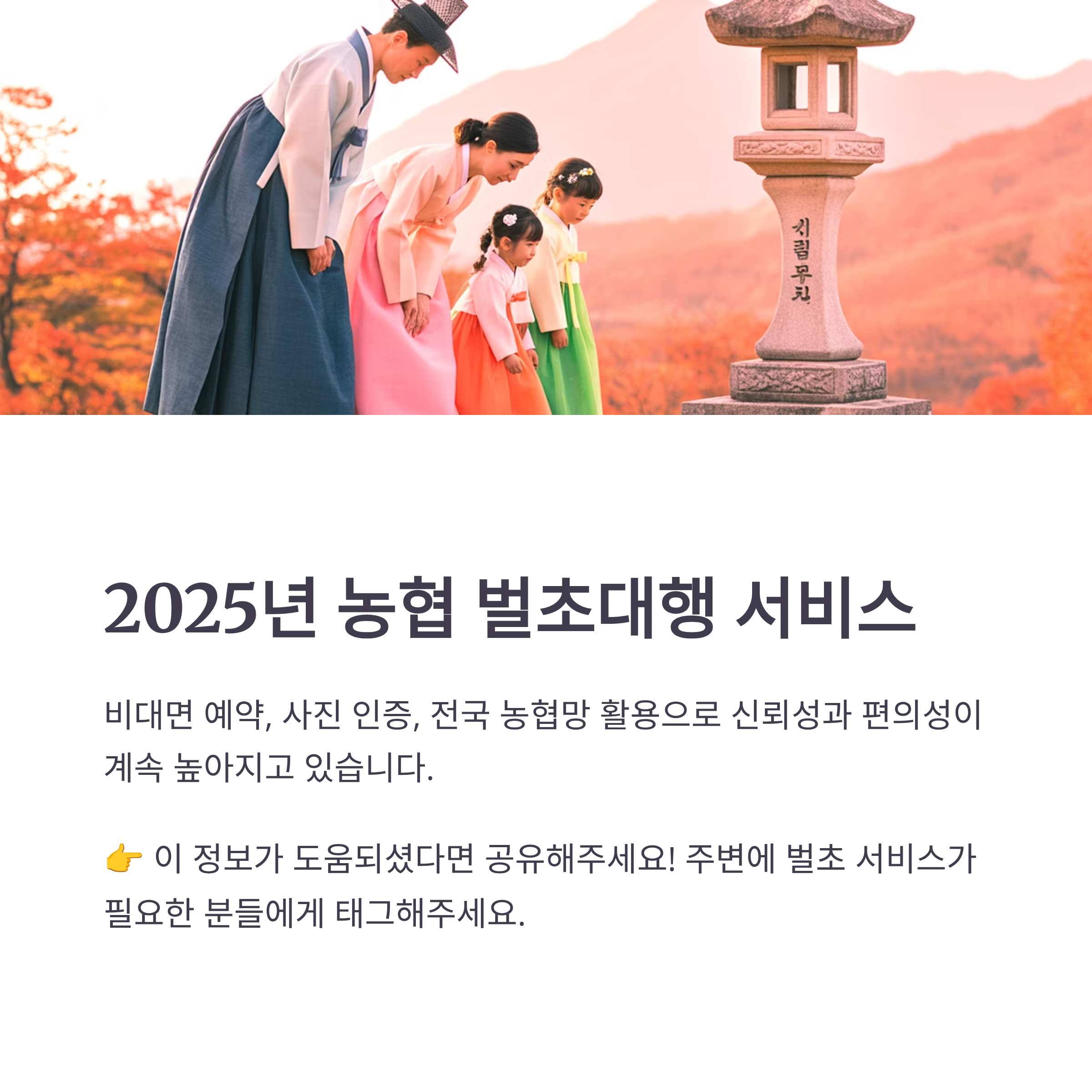- 🌐 온라인 예약: 농협 홈페이지(nonghyup.com) 또는 ‘NH농협 벌초대행’ 앱 가입 후 신청