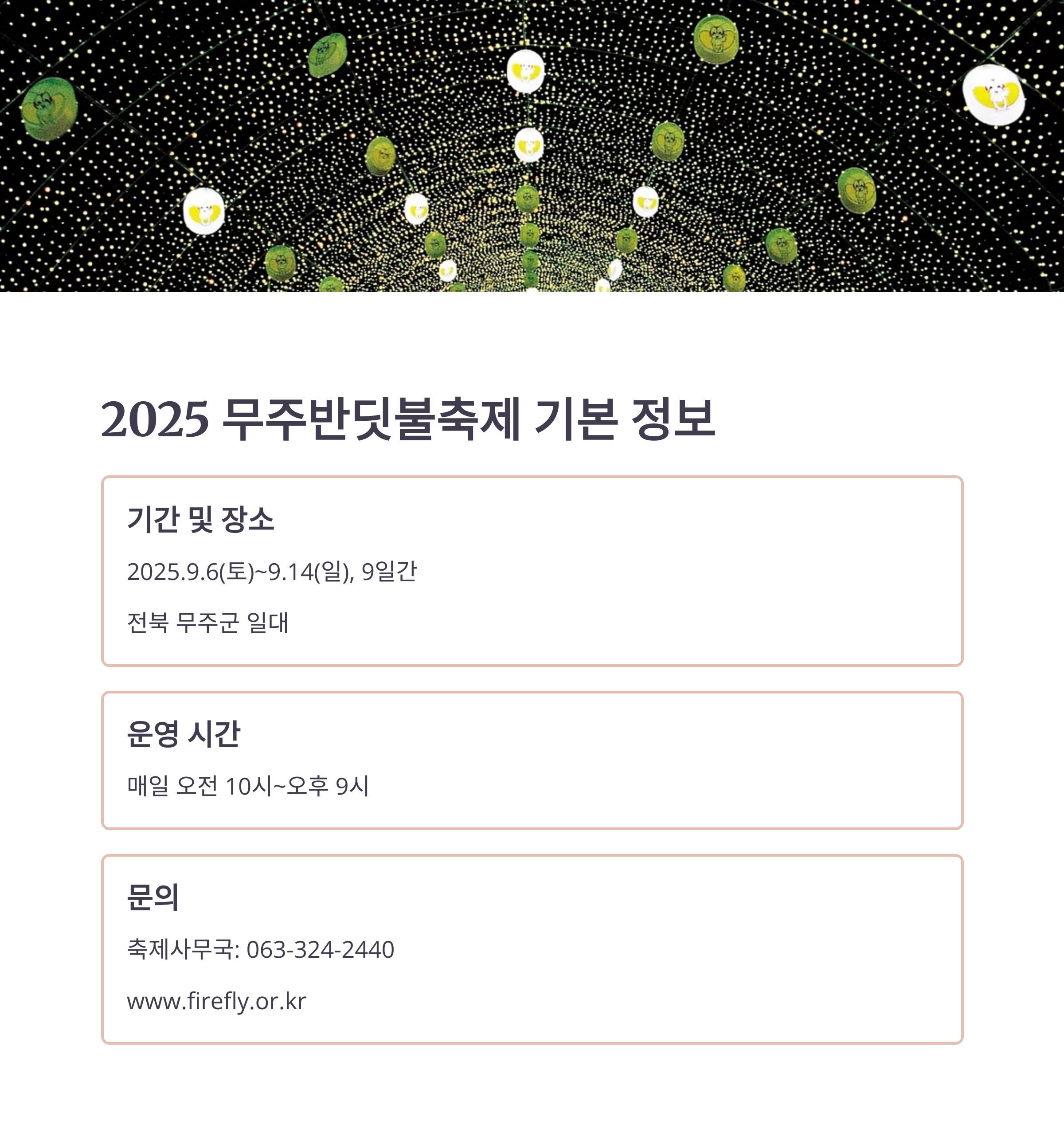 예약문의: 축제사무국 063-324-2440 / www.firefly.or.kr