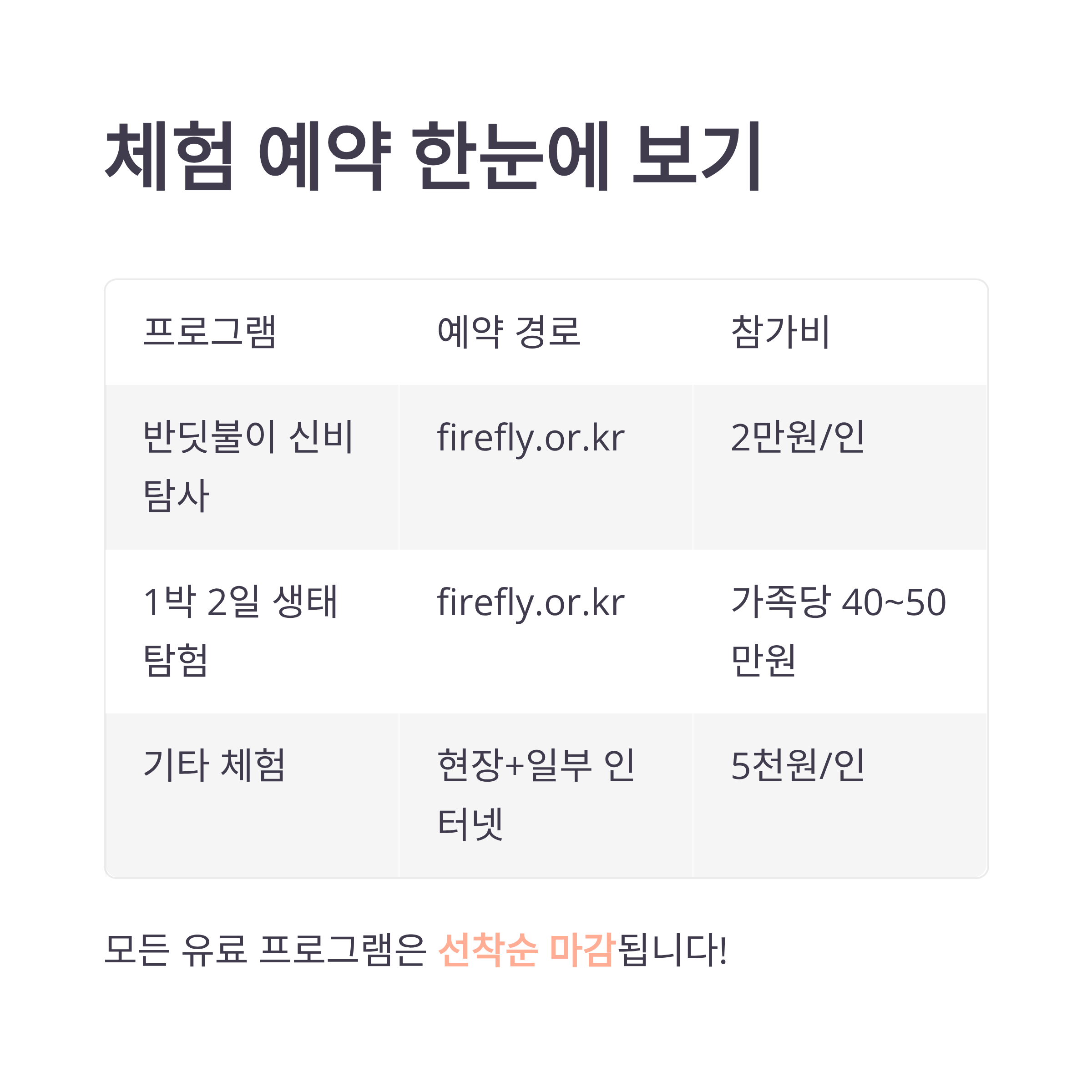 반딧불이 신비탐사부터 1박 2일 생태체험까지, 인기 체험은 매년 빠르게 마감됩니다.