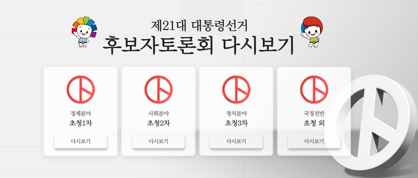 | 3차 | 5월 31일 (토) | 저녁 8시 예정 | 종합 주제 및 후보자 간 자유 토론 |