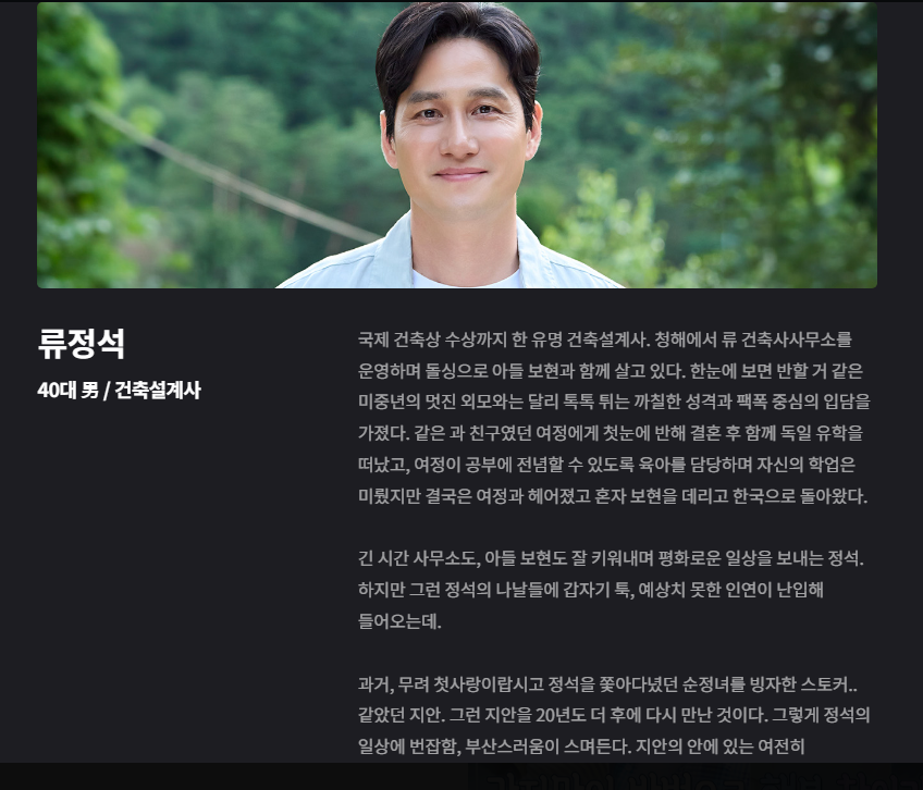 | 류정석 | 겉은 냉철하지만 속은 따뜻한 건축디자이너, 지안의 과거 첫사랑 |