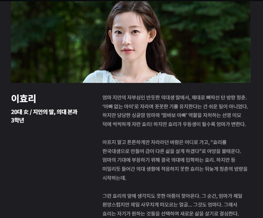 | 이효리 | 명문대 의대생, 엄마의 자랑이자 인생 전환점을 맞이하는 딸 |