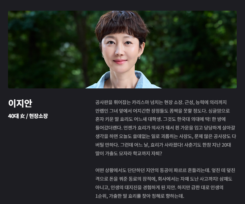 | 이지안 | 카리스마 넘치는 건설현장 소장, 의대생 딸 효리를 위해 모든 걸 바치는 싱글맘 |