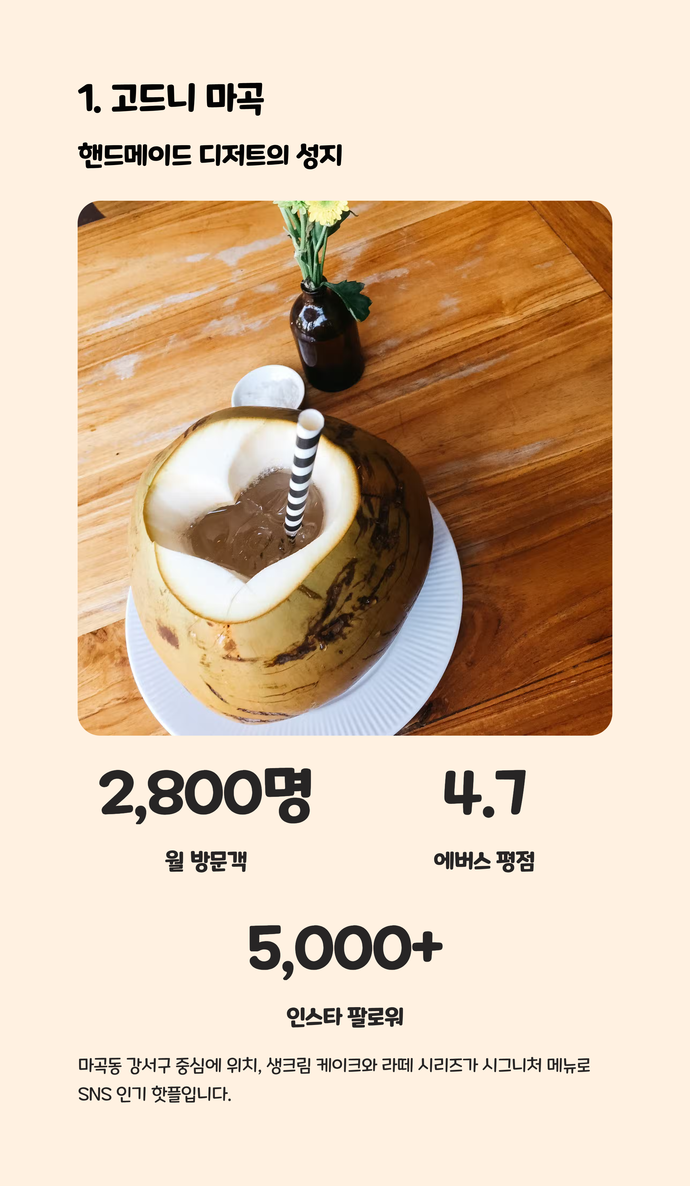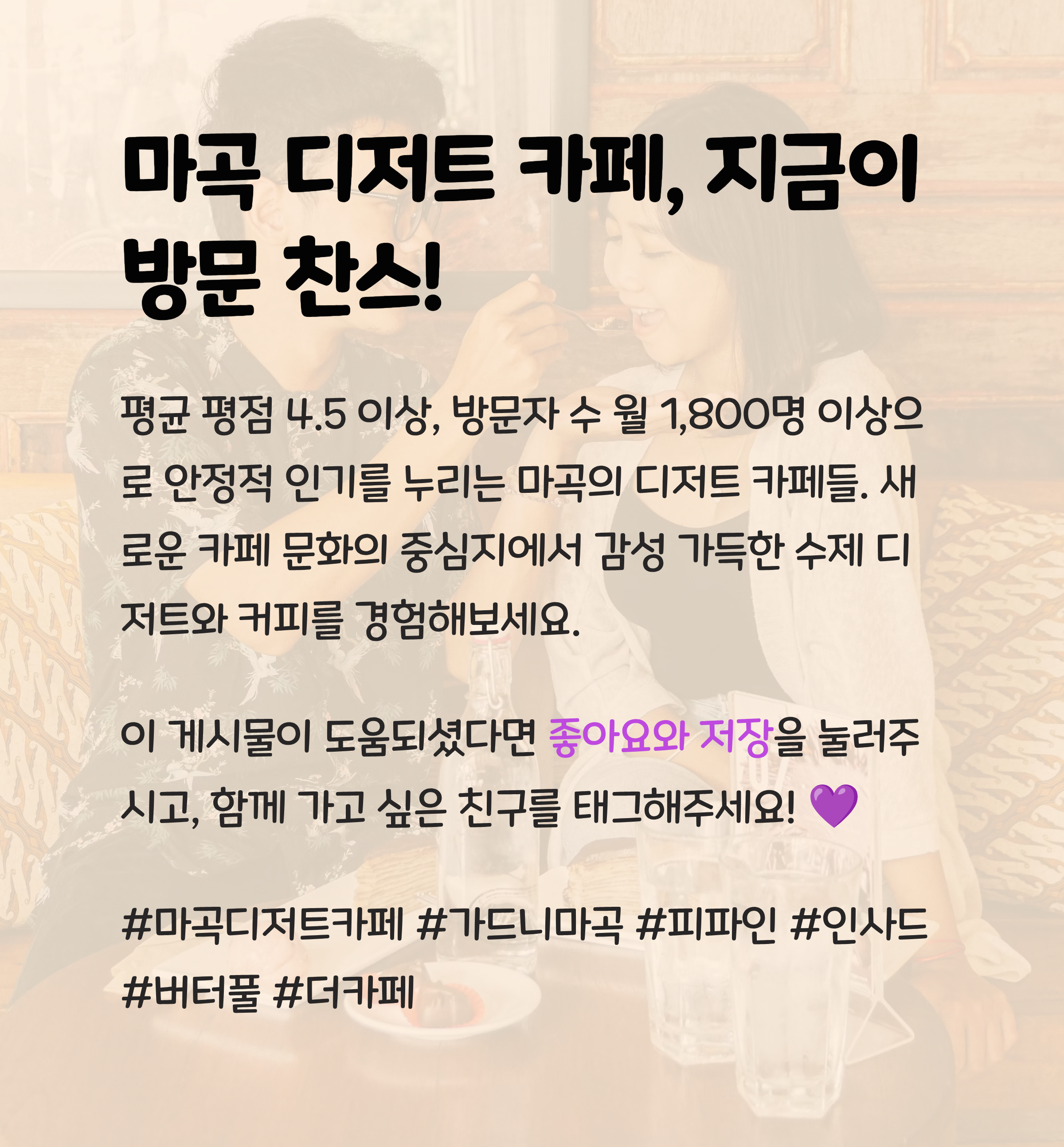 마곡의 디저트 카페는 평균 평점 4.5 이상, 방문자 수 월 1,800명 이상으로 안정적인 인기가 있습니다.