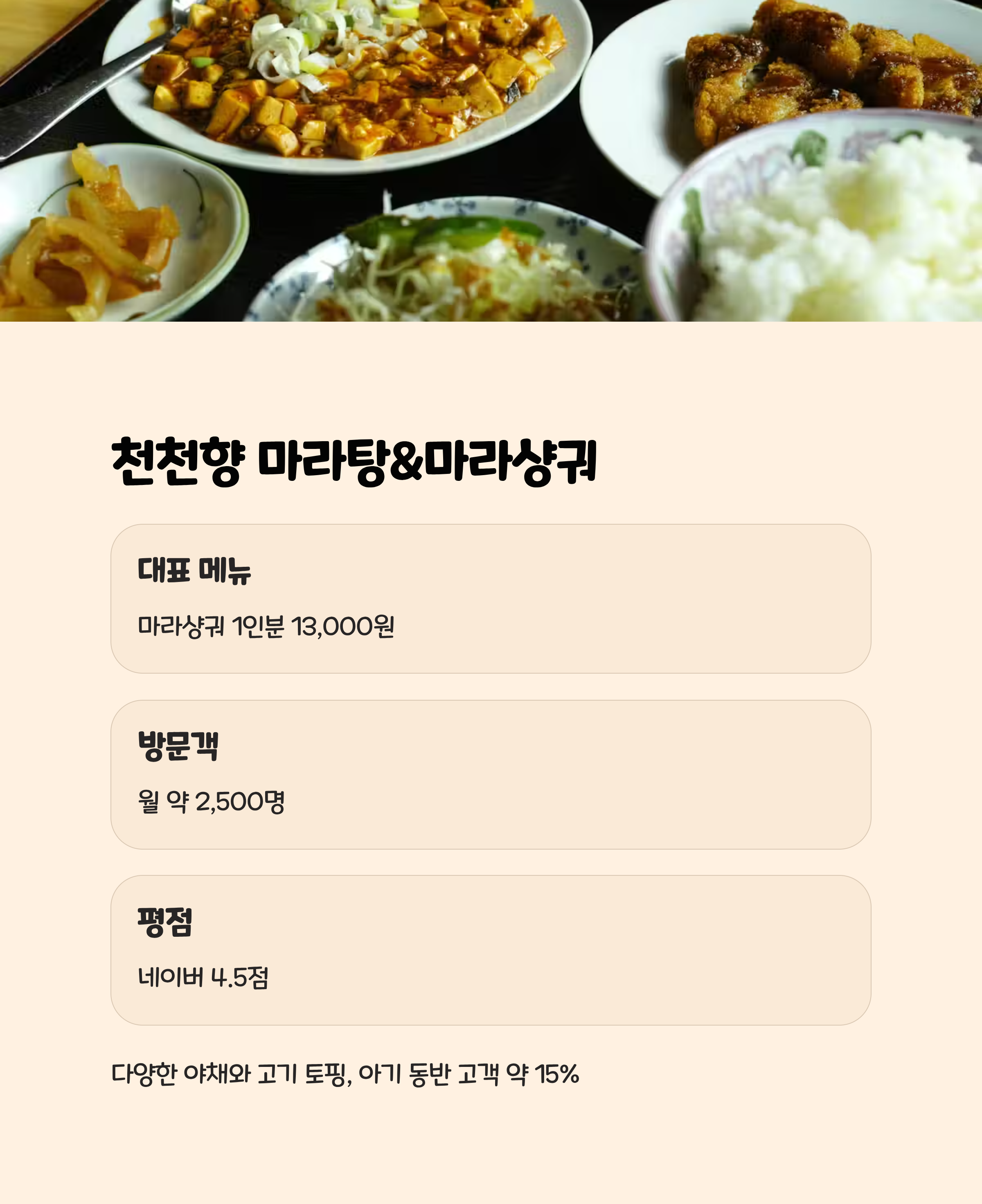 특히 라화방 마라탕 마곡점은 3단계 이상의 맵기 조절이 가능하며, 마라탕은 9,000원~11,000원, 마라샹궈는 12,000원~15,000원대로 가성비 좋은 가격대를 자랑합니다. 천향 마라탕 본점은 신선한 채소와 다양한 고기 토핑을 선택할 수 있고, 유아 고객 비율이 약 15%에 달해 가족 단위 방문객에게도 안성맞춤입니다. 동네순궈는 해산물 세트와 훠궈, 마라 요리를 한 자리에서 즐길 수 있으며, 주말 기준 하루 300명 이상이 방문할 정도로 높은 고객 만족도(92%)를 기록하고 있습니다.