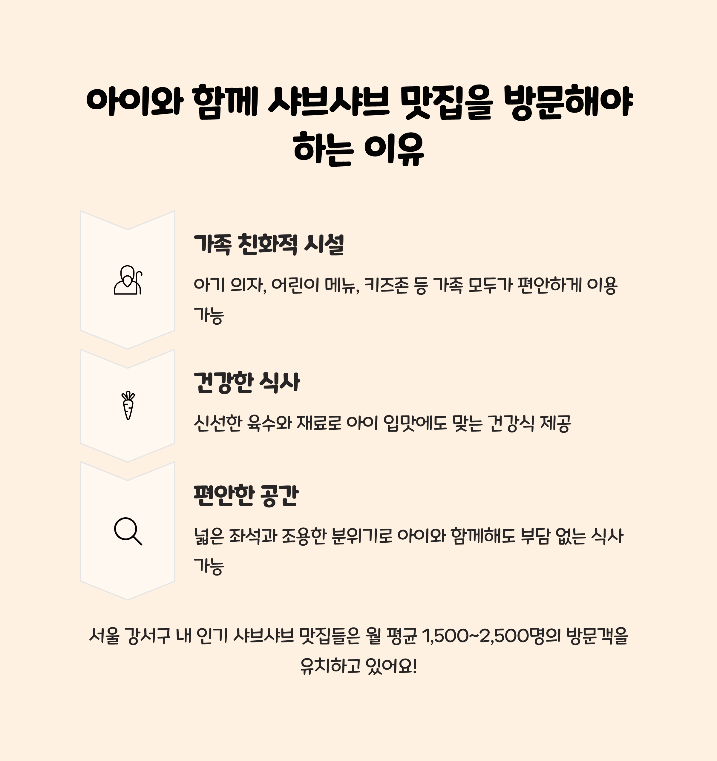 마곡 샤브샤브 맛집들은 유아용 의자, 어린이 메뉴, 키즈존 등 가족 친화적인 시설이 잘 갖춰져 있습니다.