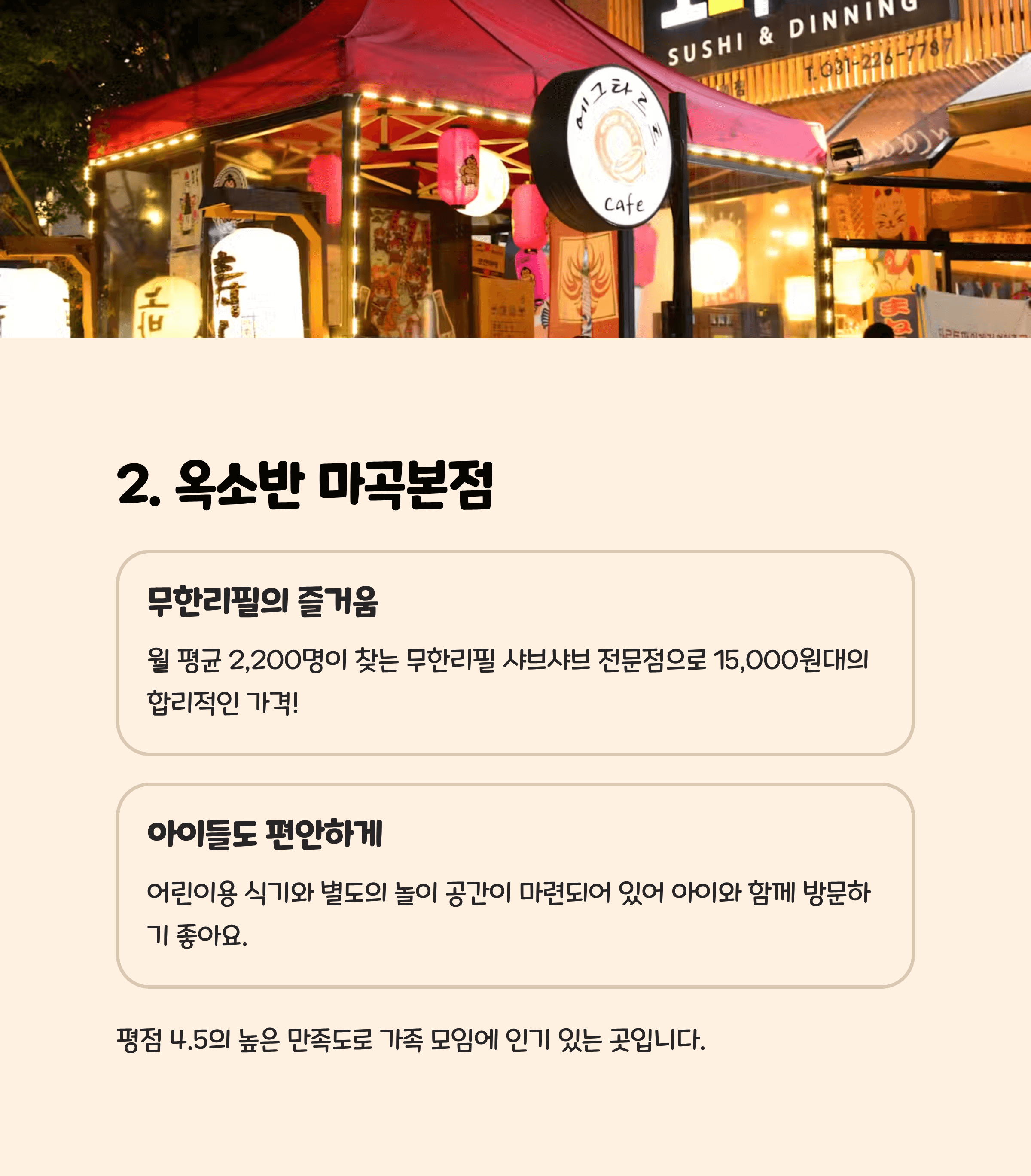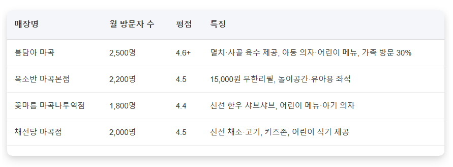 평균 월 방문자 1,500~2,500명, 평점 4.3~4.6으로 강서구 마곡 지역에서 가족 외식 장소로 꾸준히 사랑받고 있습니다.