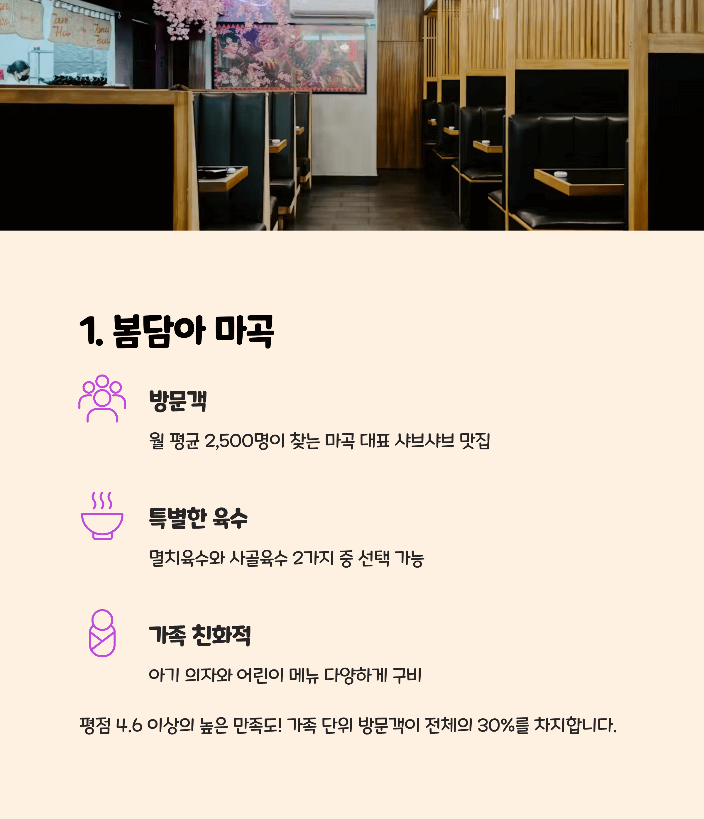 1. 봄담아 마곡 – 두 가지 육수와 가족 친화 서비스