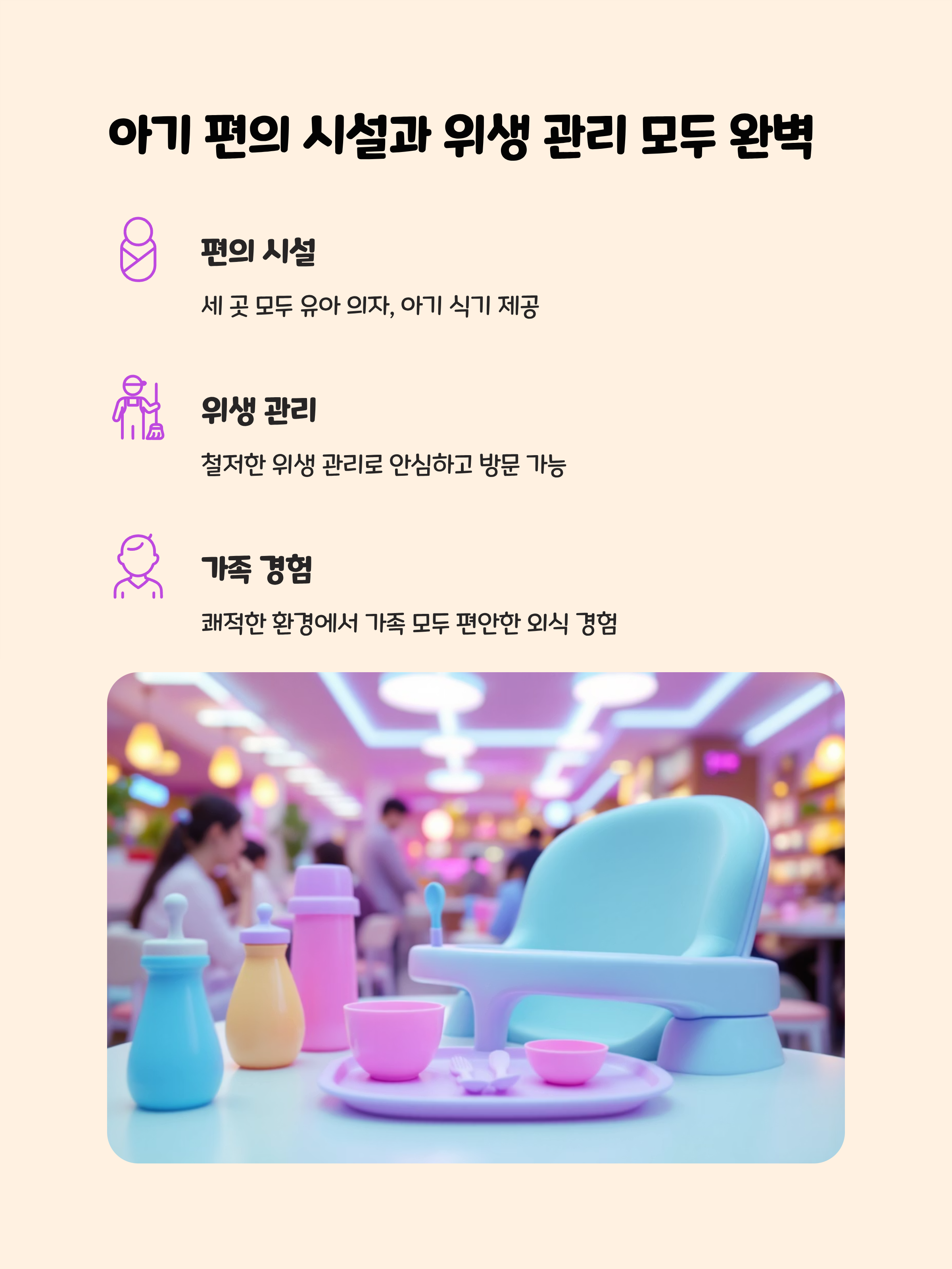 - 아기 위한 환경(아기의자, 유아식기, 키즈식판)은 세 곳 모두 평균 3세 이하 유아 동반 방문 비율이 20% 내외로 매우 높음.