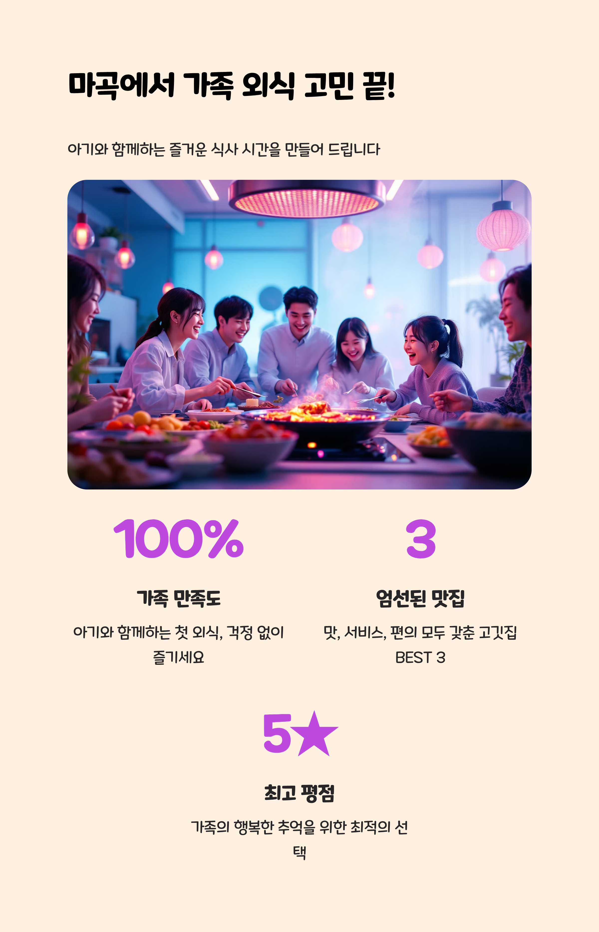 아기와 외식 시 위 세 곳은 모두 높은 만족도, 쾌적한 환경, 검증된 맛과 서비스로 마곡 지역 ‘가족 고깃집’ BEST 3로 손꼽힙니다.