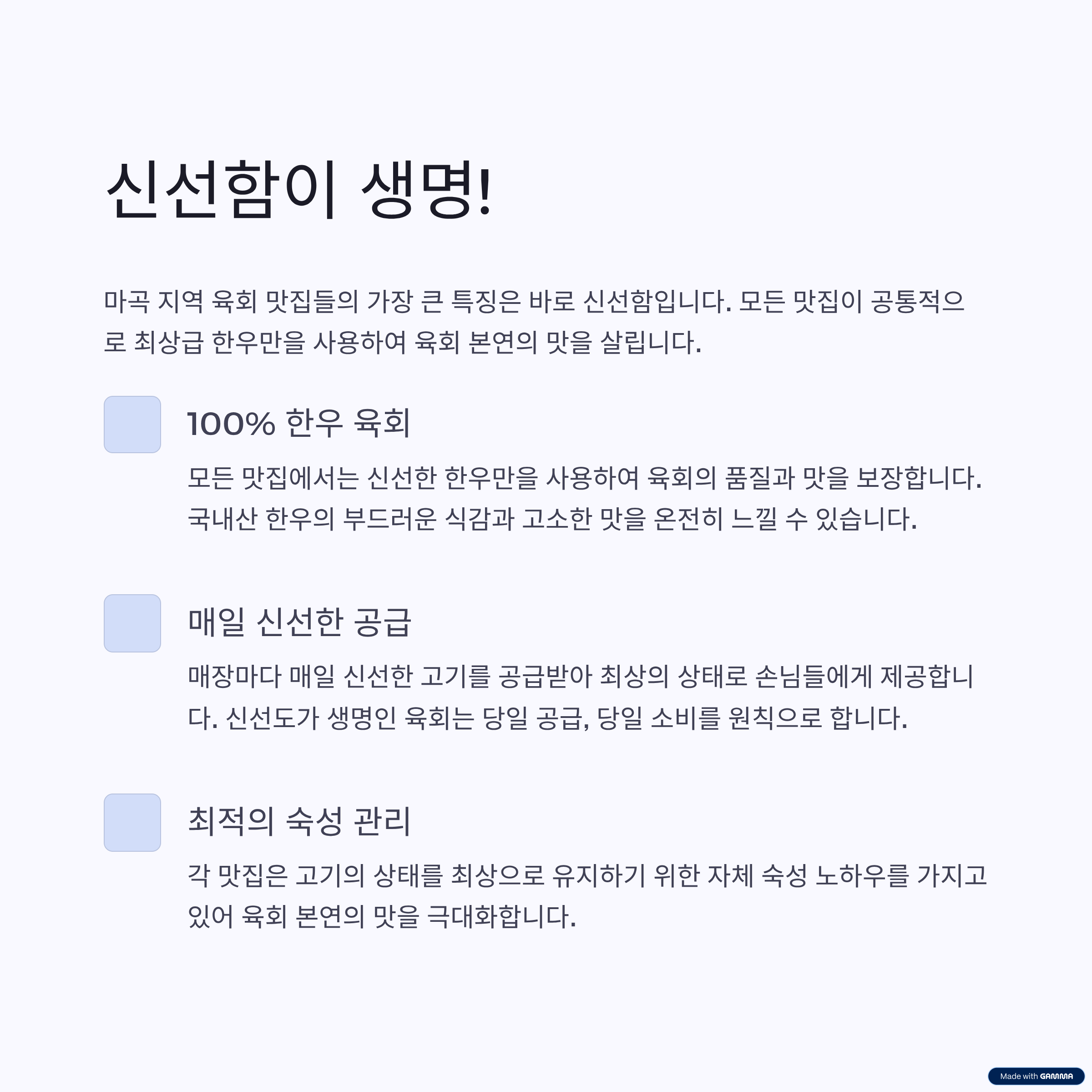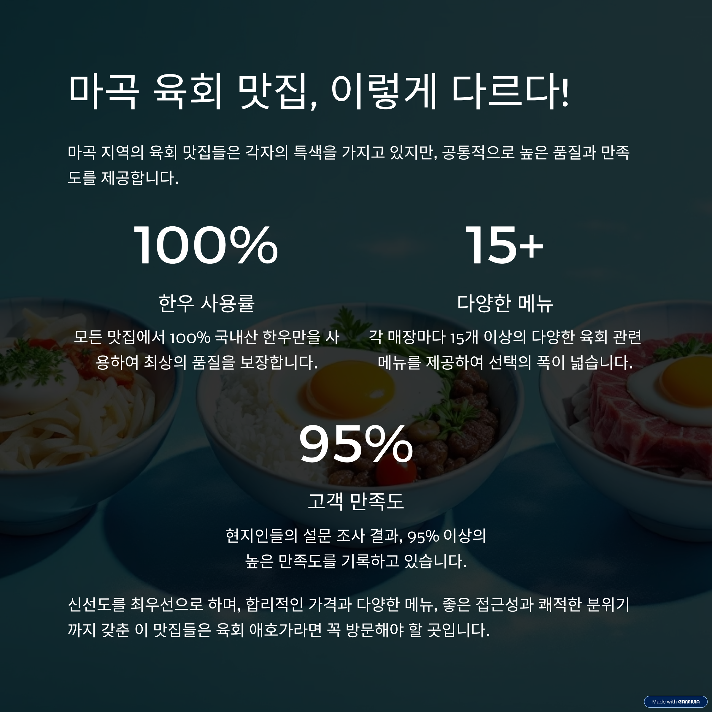 특히 각 매장은 각각의 시그니처—숙성 한우, 당일 도축 신선육회, 융합 메뉴, 프리미엄 분위기 등—로 차별화하여, 마곡 육회 맛집이 왜 극찬받는지 숫자와 데이터로 입증할 수 있습니다.