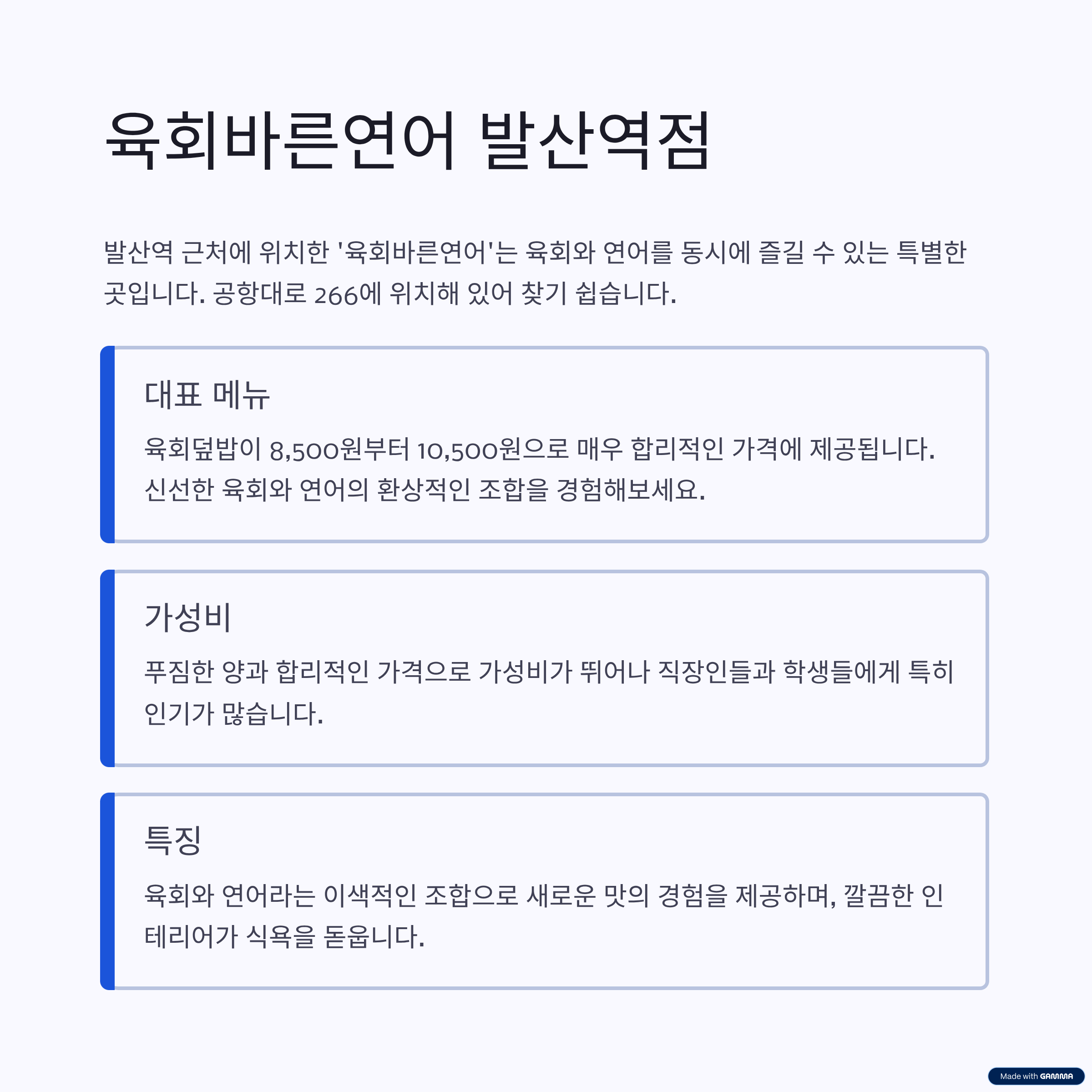 - 매장 분위기와 접근성: 실내가 깔끔하고, 직장인·단체회식 공간이 많음. 마곡나루역·발산역 인접, 도보 2~5분 이내.