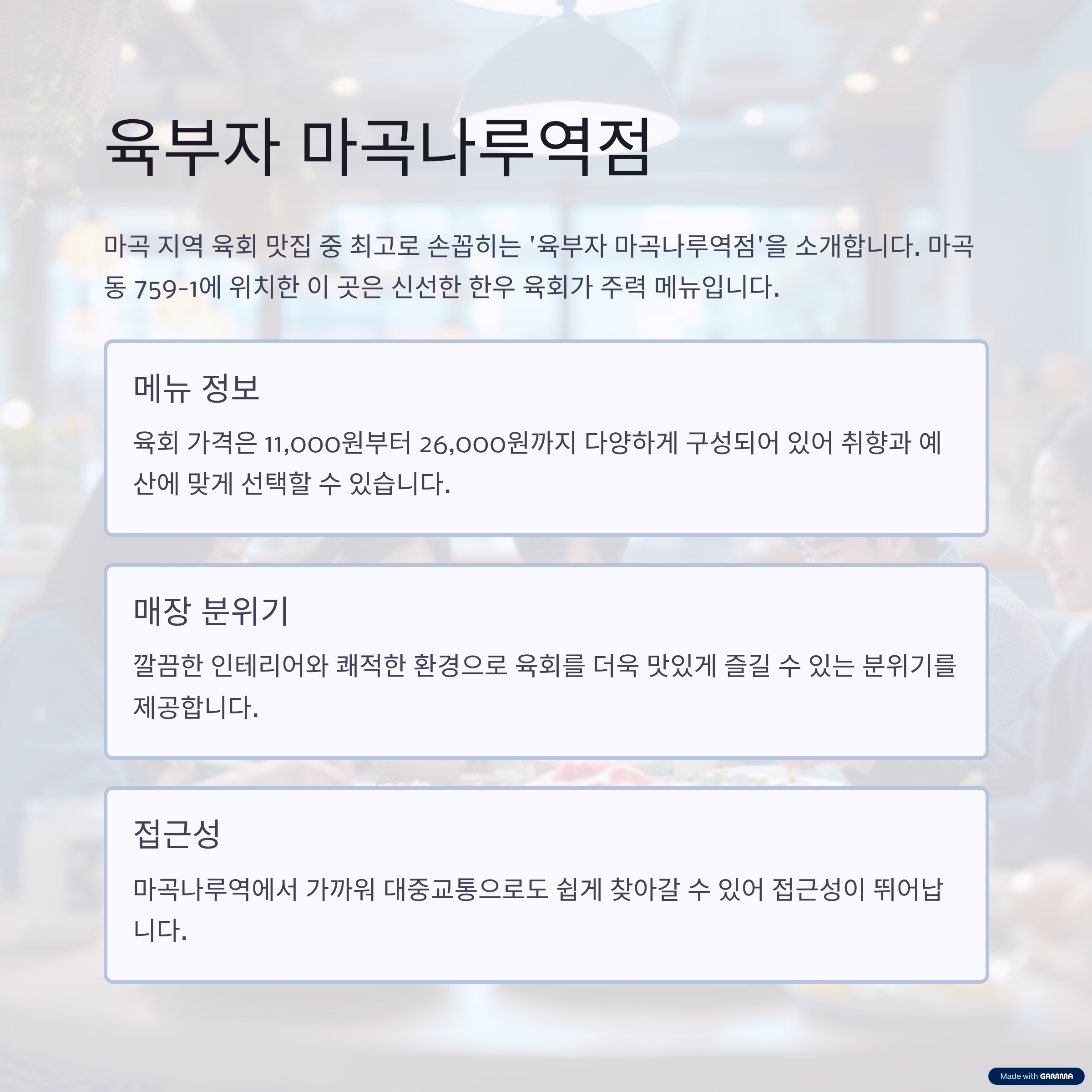 - 가성비: ‘육부자’ 800g 단위 모듬 메뉴, ‘육회바른연어’ 1만원 내외 덮밥 등, 마곡 평균 육회 가격대 대비 15~23% 저렴(2024년 서울 육회 전문점 평균가 27,500원).