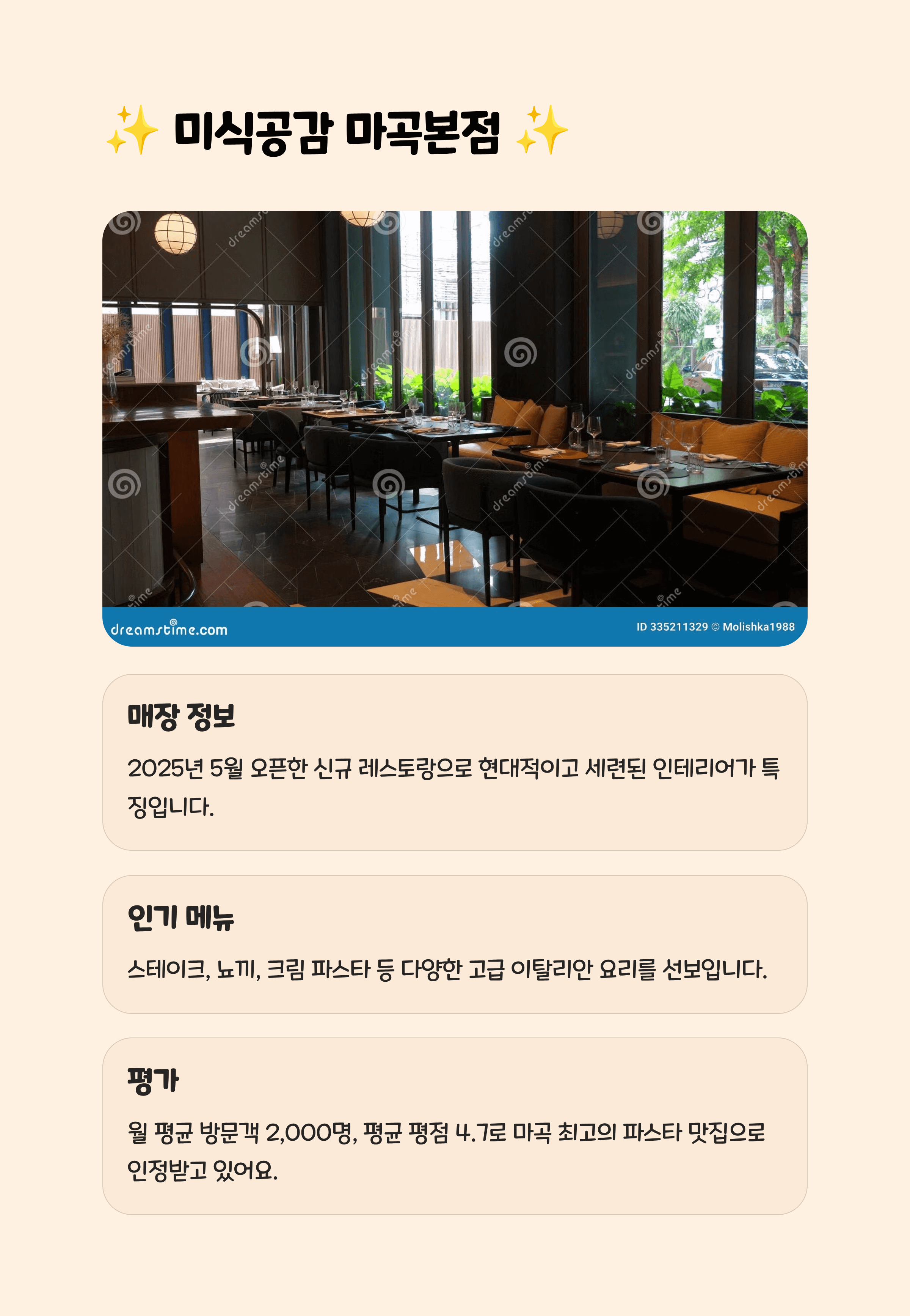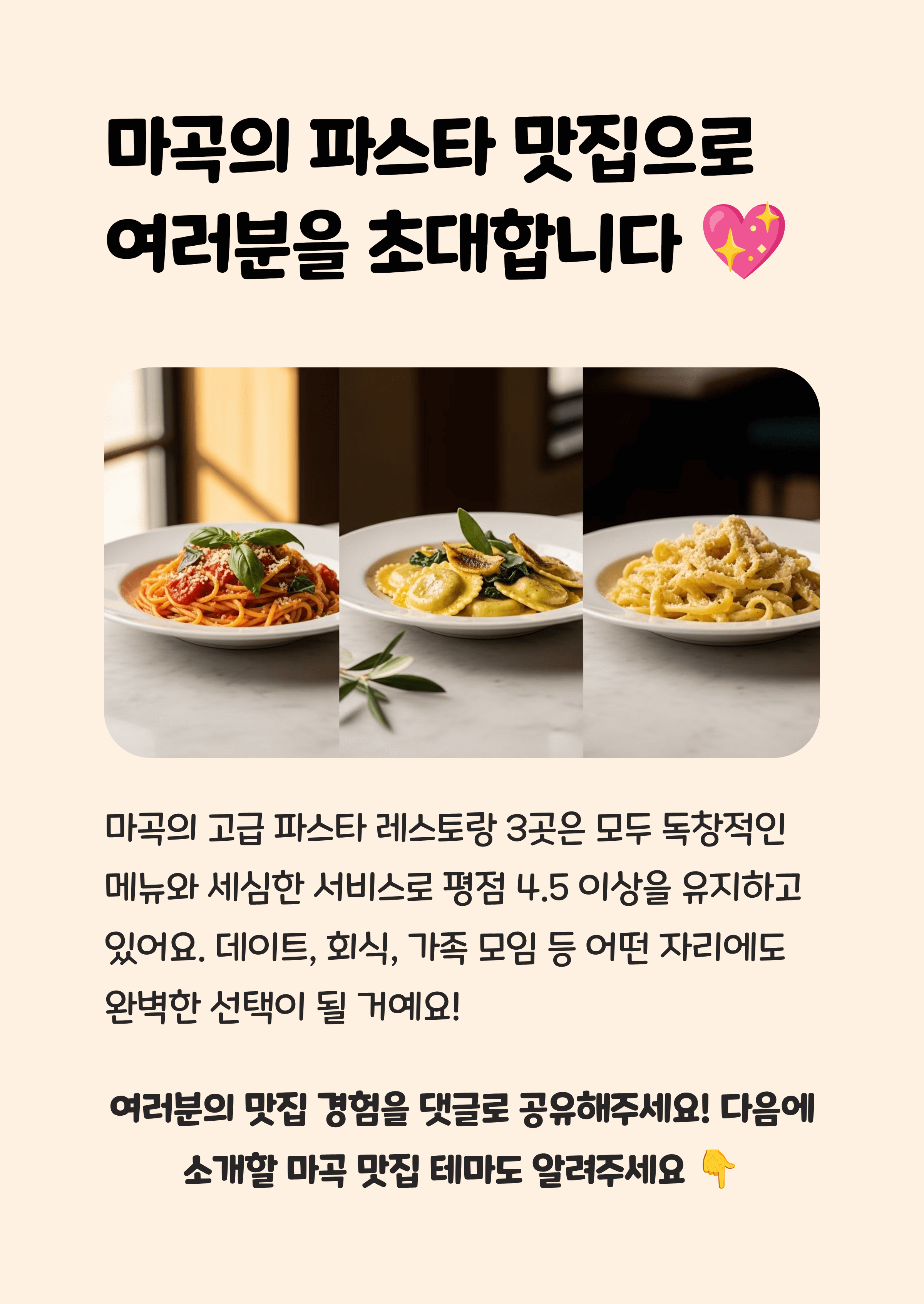 마곡은 최근 고급스러운 이탈리안 다이닝과 파스타 전문점이 늘어나며 데이트, 저녁 식사, 가족 모임 장소로 주목받고 있습니다.