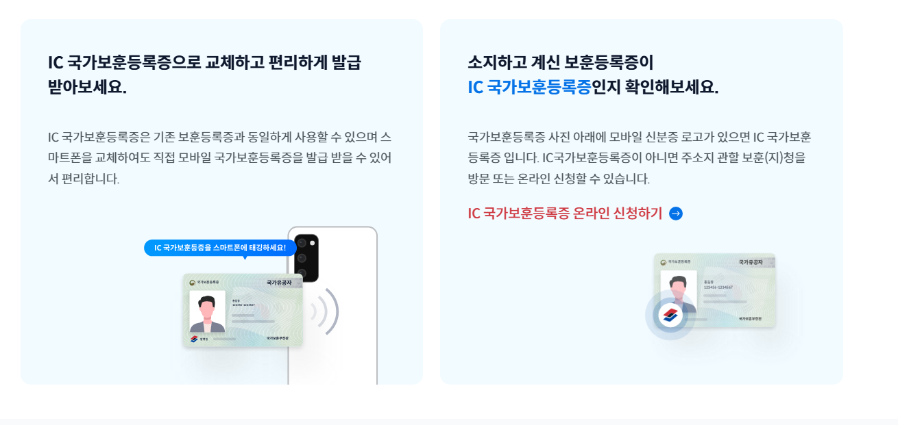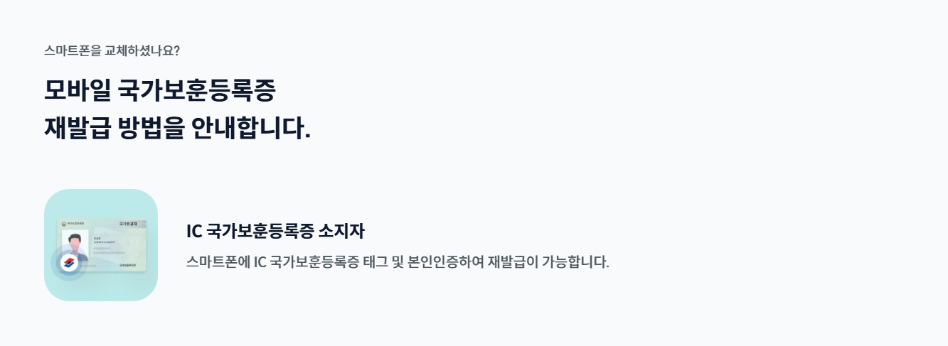 스마트폰을 교체했더라도 걱정하지 마세요! IC 국가보훈등록증을 스마트폰에 태그하고 본인인증을 거치면 재발급이 가능합니다. 기존 국가보훈등록증만 소지하고 있다면, 관할 보훈(지)청 방문 또는 온라인 신청을 통해 IC 국가보훈등록증으로 교체 후 발급받으실 수 있습니다.