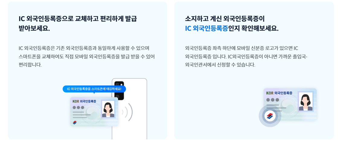 IC 외국인등록증은 기존 카드와 동일하게 사용할 수 있으며, 스마트폰 교체 후에도 직접 모바일 외국인등록증 발급이 가능합니다. 먼저 본인 소지 카드가 IC 외국인등록증인지 확인한 후 절차를 진행하세요.