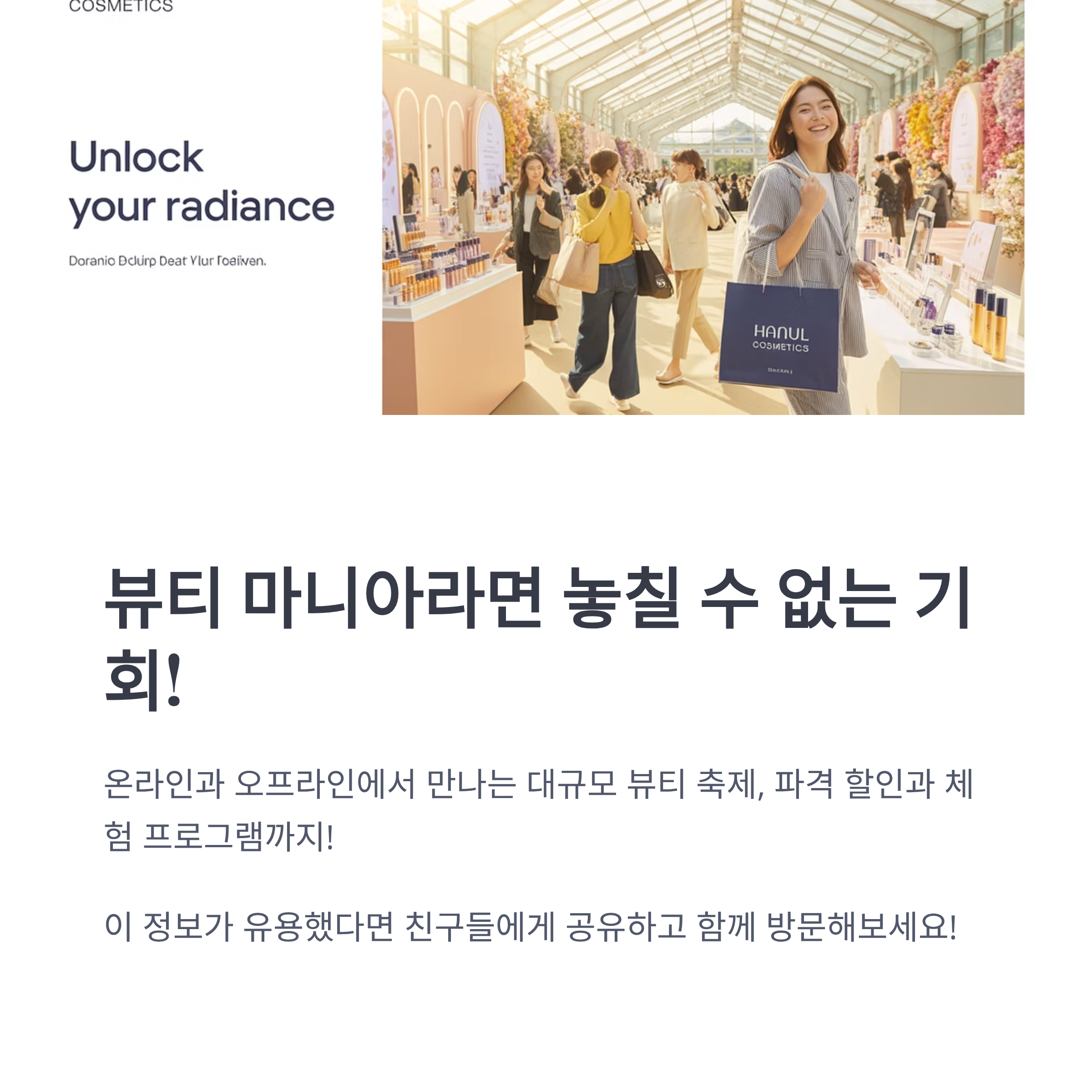 뷰티 브랜드 할인과 체험 이벤트, 풍성한 경품까지 준비되어 있어 뷰티 트렌드를 한눈에 보고 경험할 수 있는 절호의 기회가 될 것입니다.