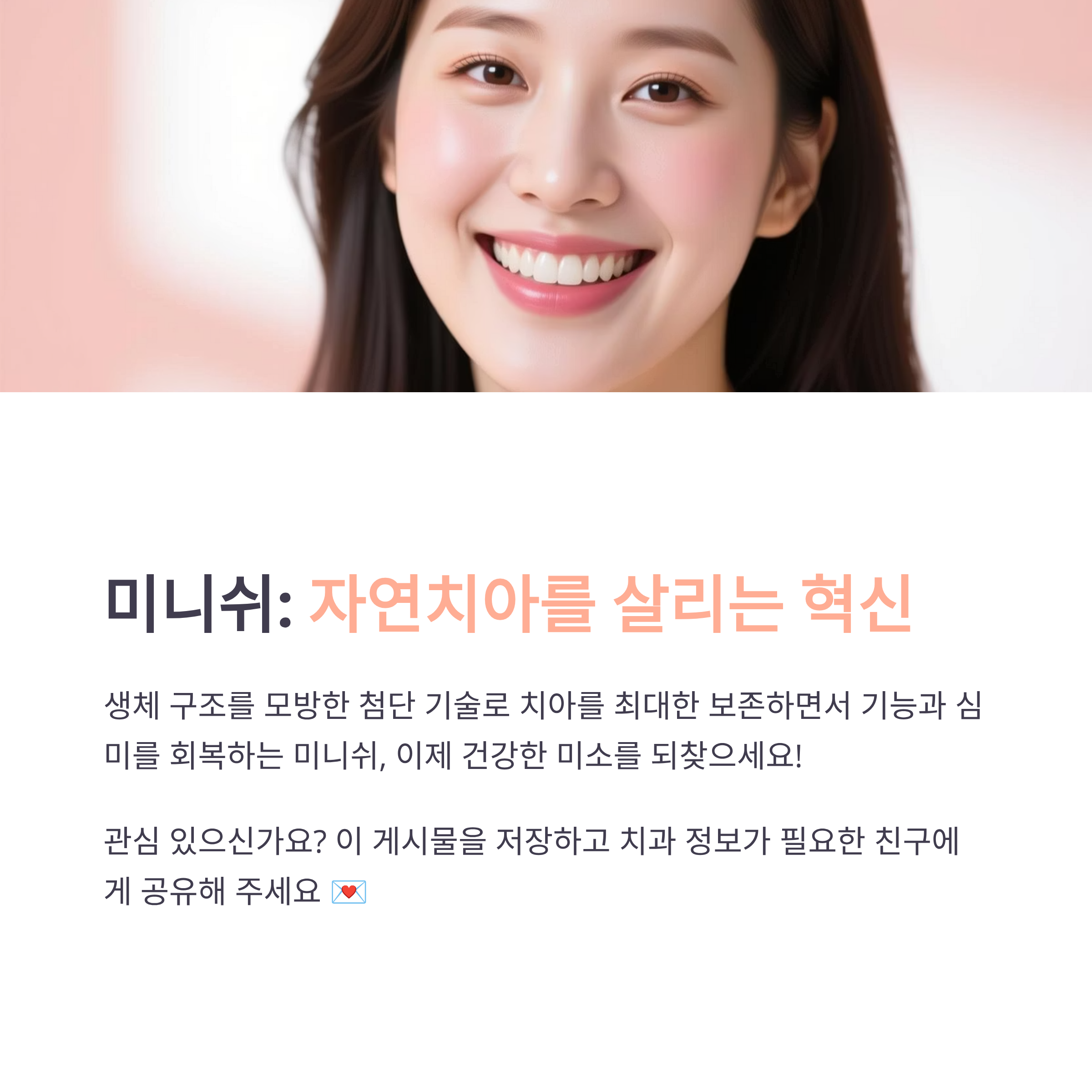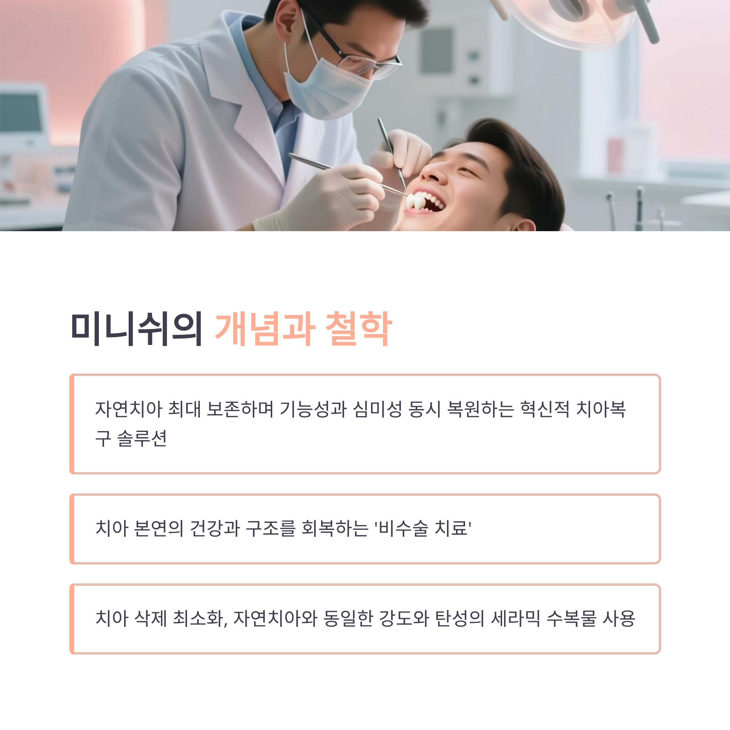 - 미니쉬는 자연 치아 삭제를 최소화하고 치아 구조와 건강을 보존하는 철학을 기반으로 합니다.