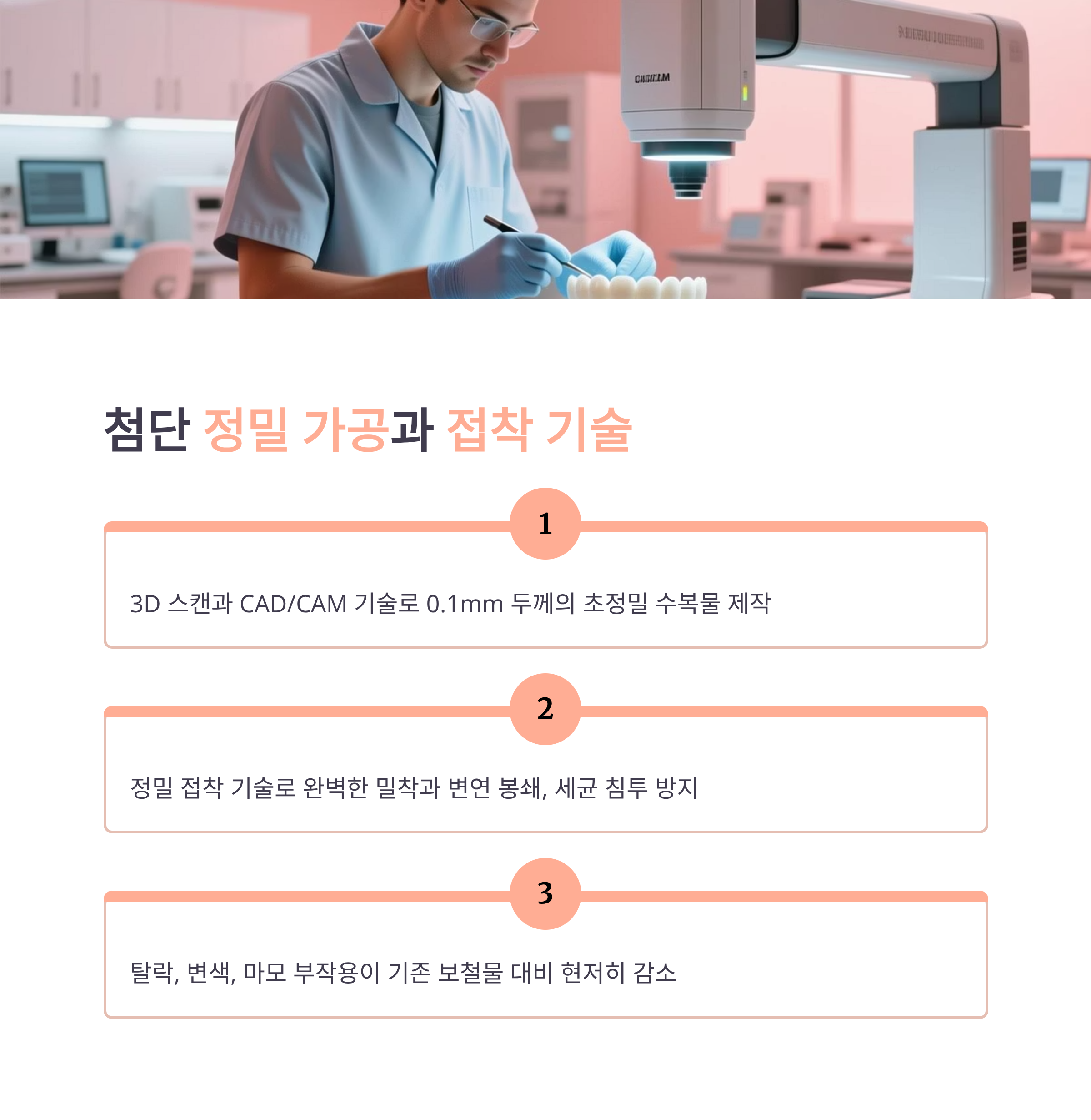- 3D 스캔과 CAD/CAM 기술로 0.1mm 단위의 초정밀 보철 제작.