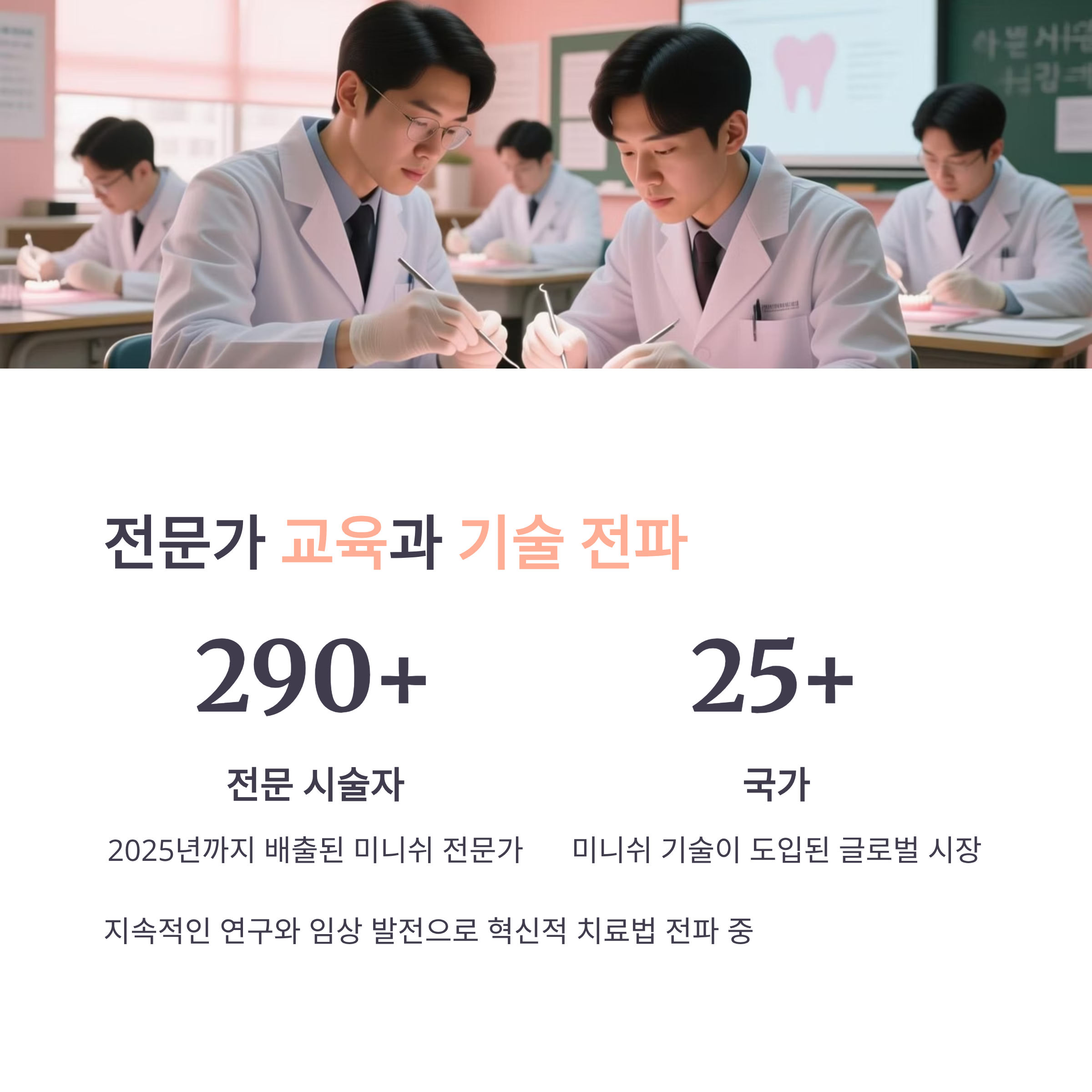 - 국내외 치과의사 대상 지속적인 교육과 연구개발 진행.