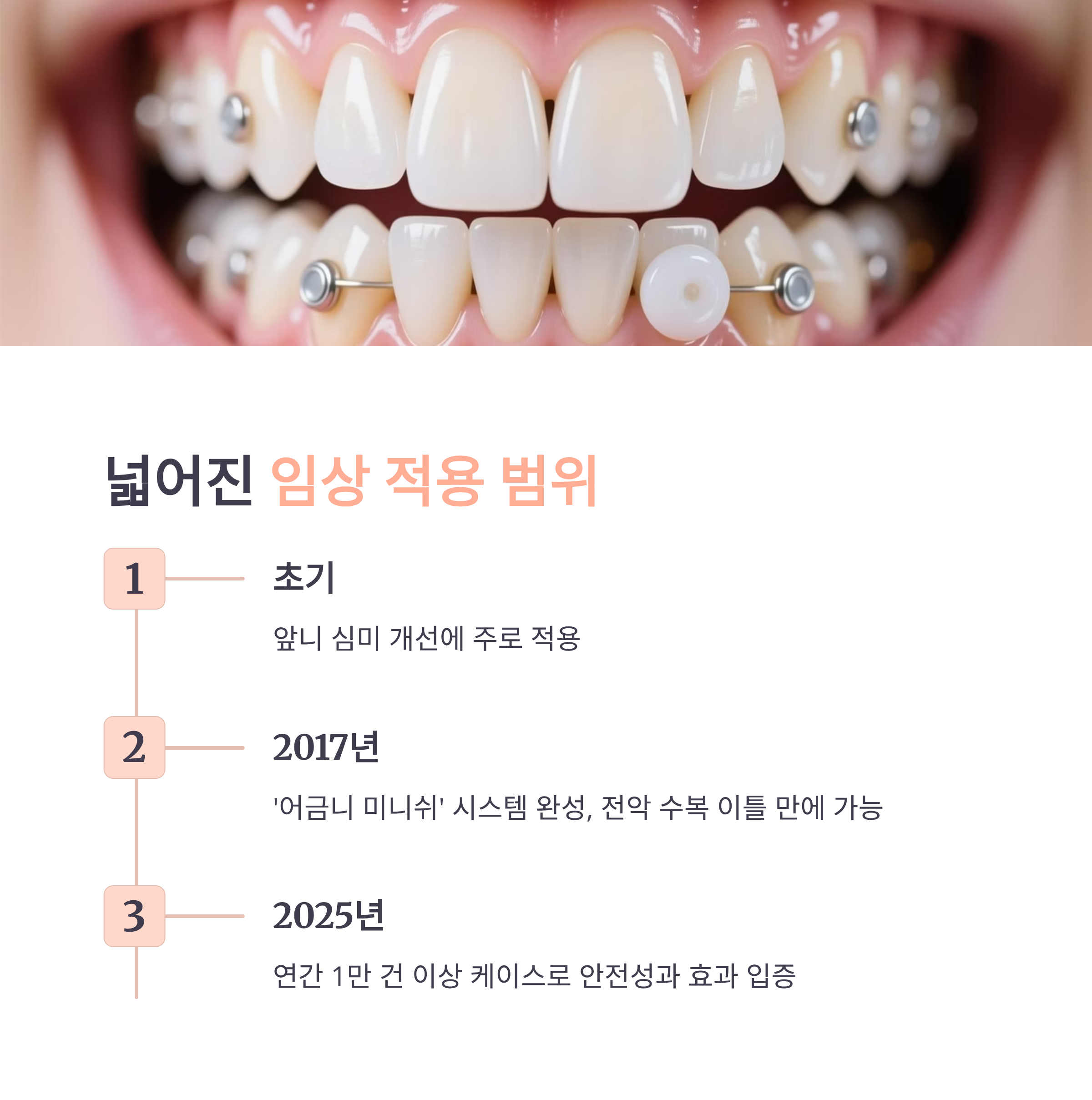 2025년 현재, 미니쉬는 안전성과 장기 유지력, 환자 만족도 측면에서 가장 진보된 치아 회복 솔루션으로 자리잡았습니다.