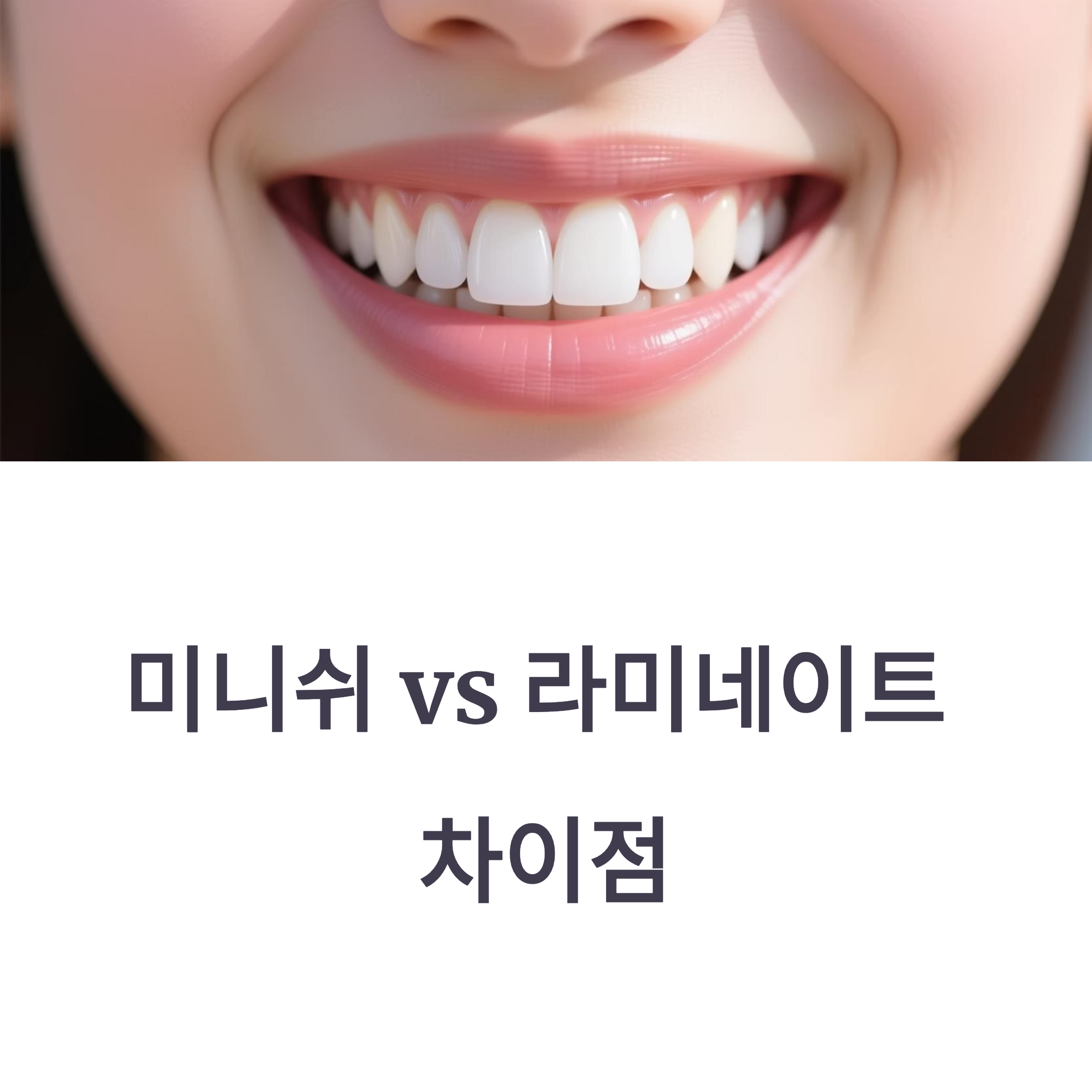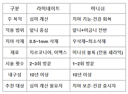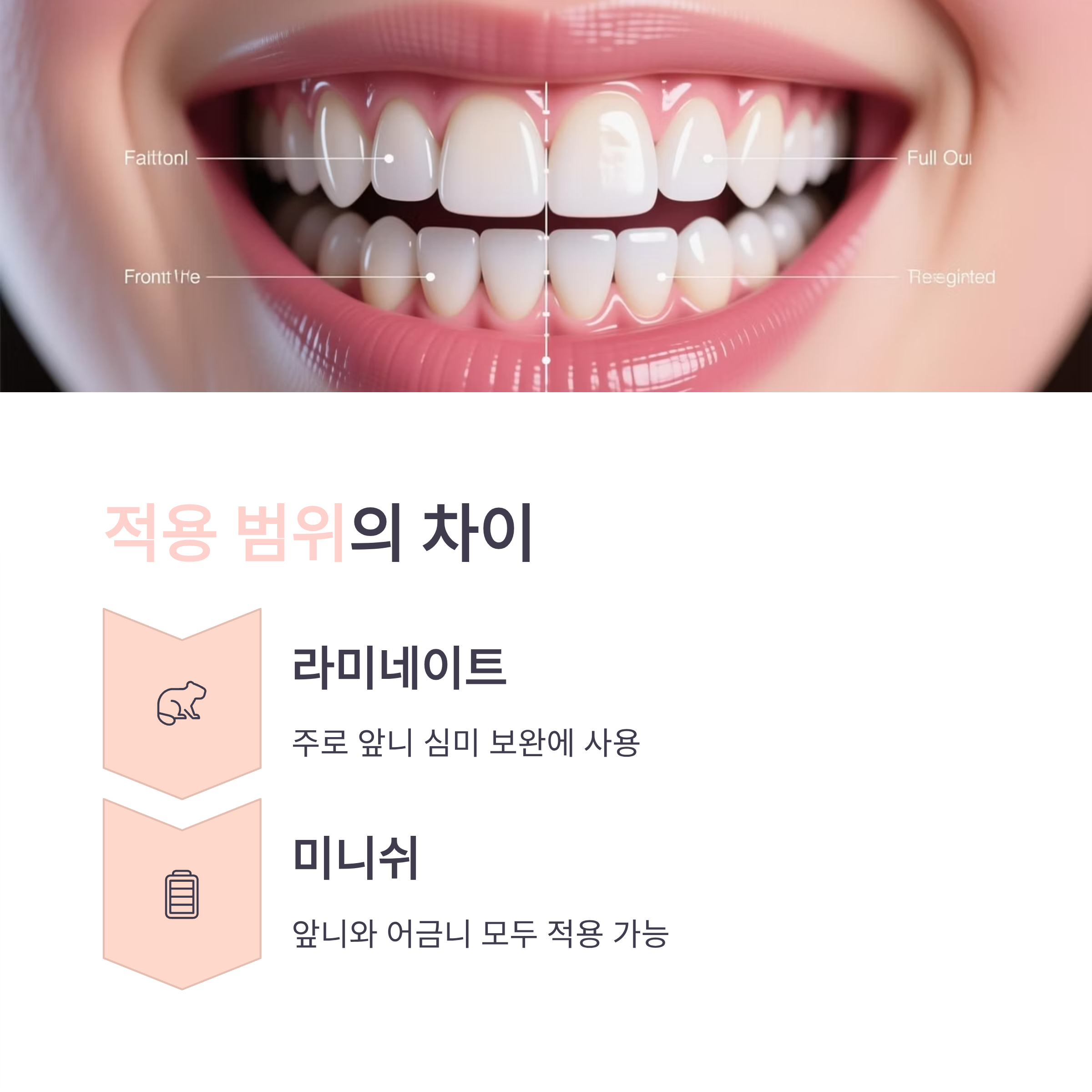 - 미니쉬: 앞니뿐 아니라 어금니까지 모든 치아 적용 가능. 더 광범위한 치아 손상 및 상태 개선 가능.