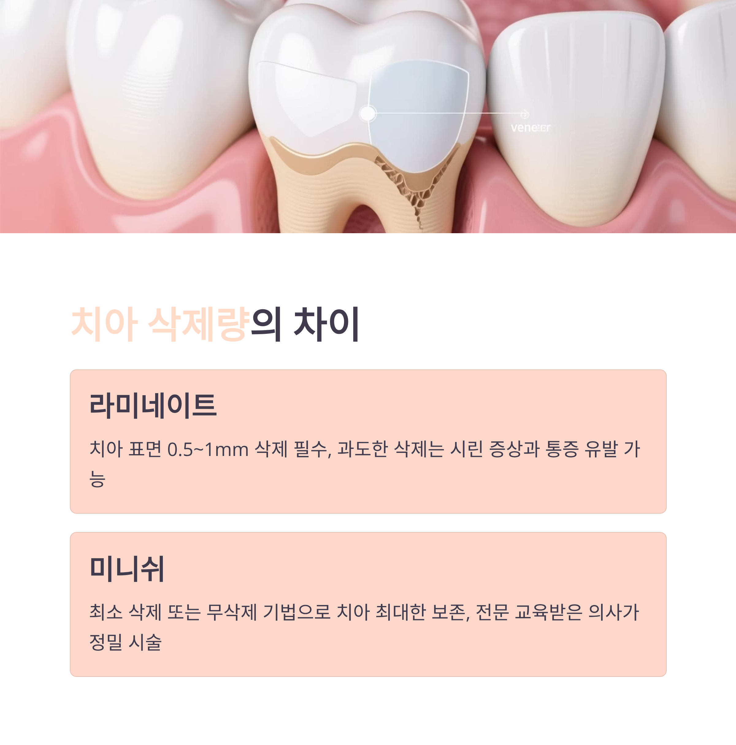 - 라미네이트: 치아 표면 삭제 필요. 과도한 삭제 시 시림, 통증, 치아 건강 악화 우려.