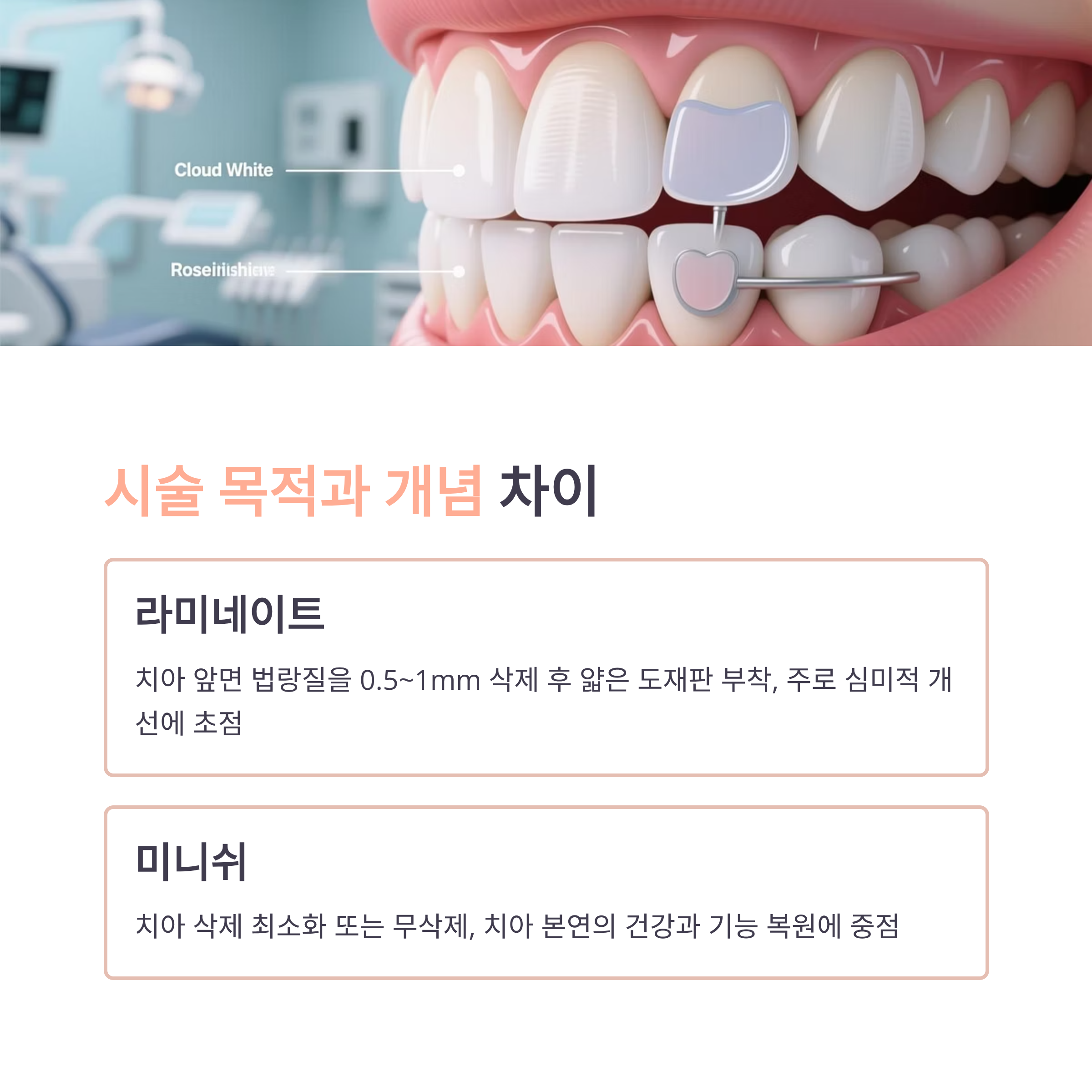 두 시술 모두 심미적 개선을 목표로 하지만, 접근 방식과 치아 보존 정도, 적용 범위에서 뚜렷한 차이가 있습니다.
