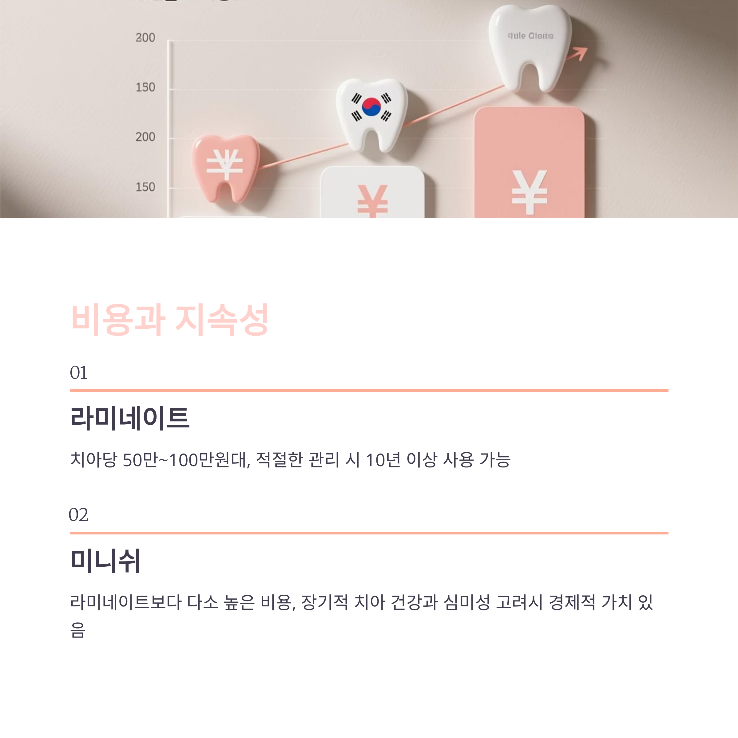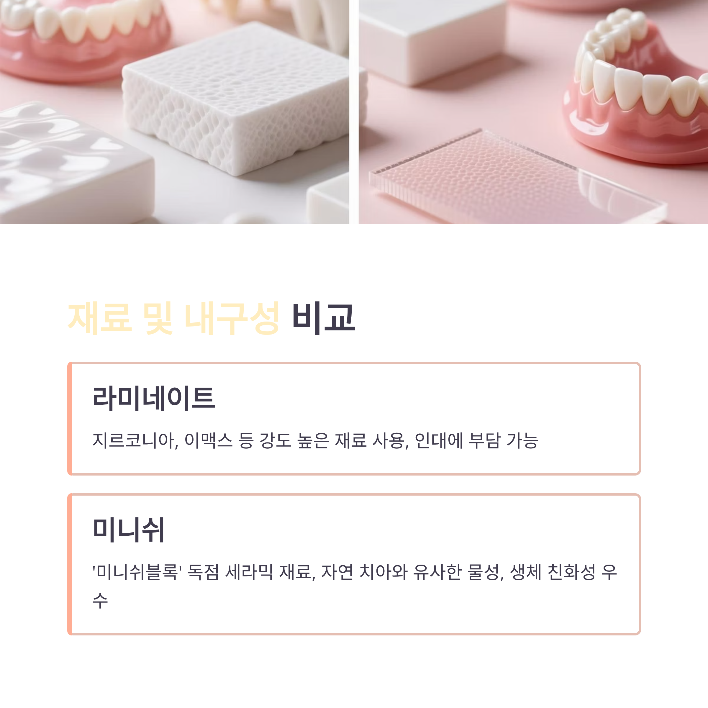 - 미니쉬: 라미네이트보다 다소 높은 비용(독점 소재·정밀 시술). 하지만 장기적 치아 건강·심미성 고려 시 경제적.