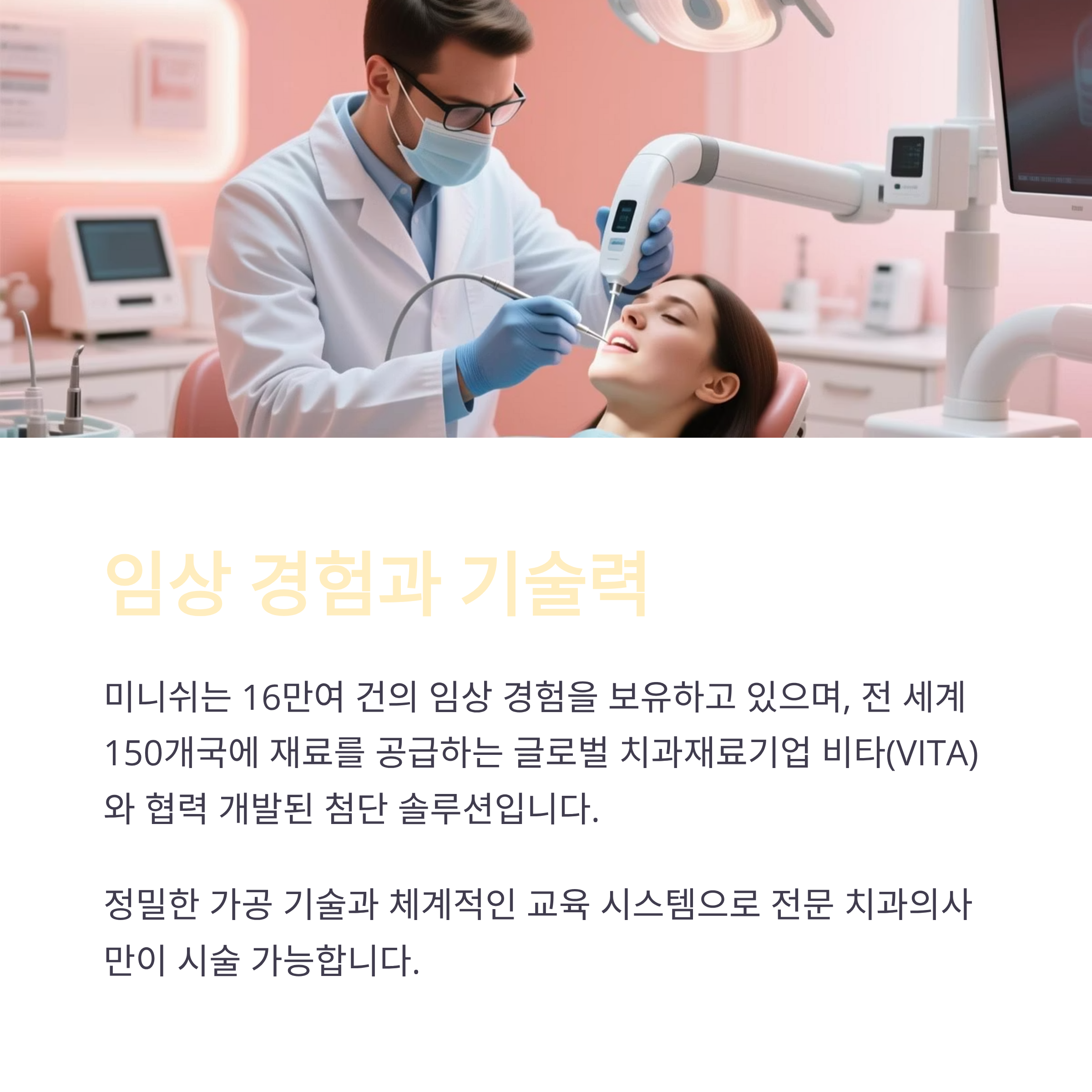 - 미니쉬: 글로벌 치과재료사 비타(Vita)와 협력 개발. 150개국 공급·150회 이상의 임상 경험.