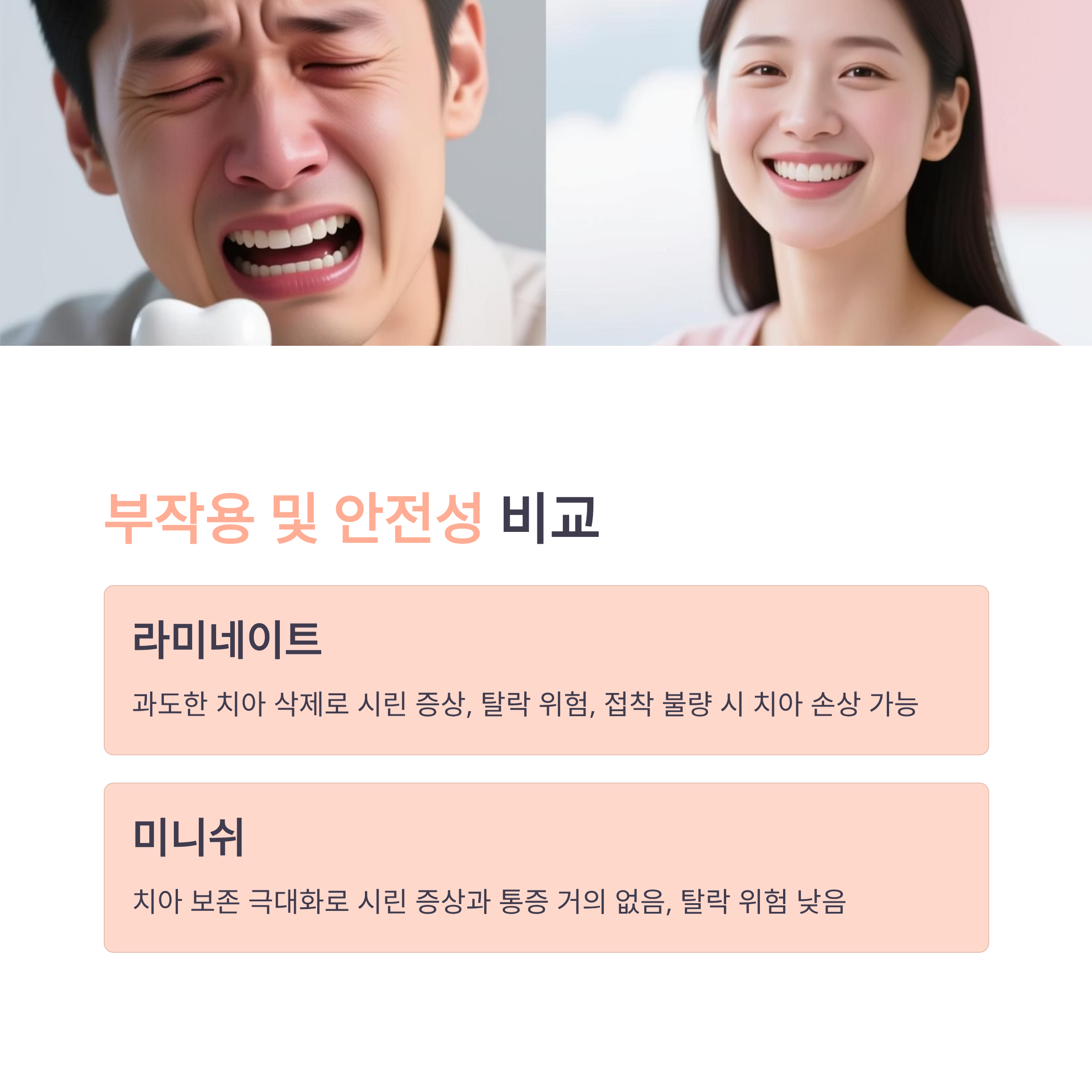 - 라미네이트: 과도 삭제 시 치아 손상, 접착 불량 시 탈락·시림 발생 위험.