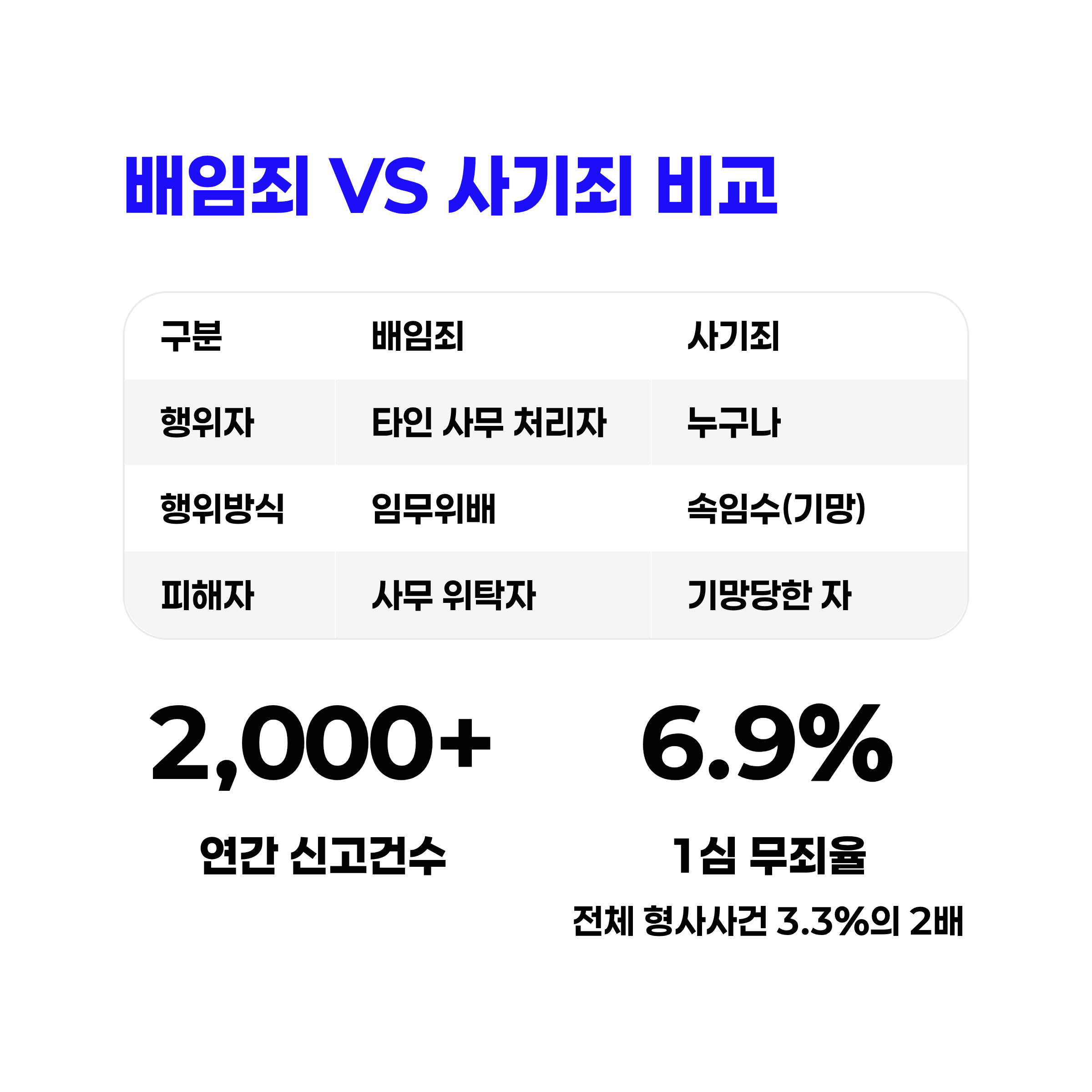 배임죄는 흔히 사기죄와 혼동되기도 하지만, 구성 방식은 매우 다릅니다.