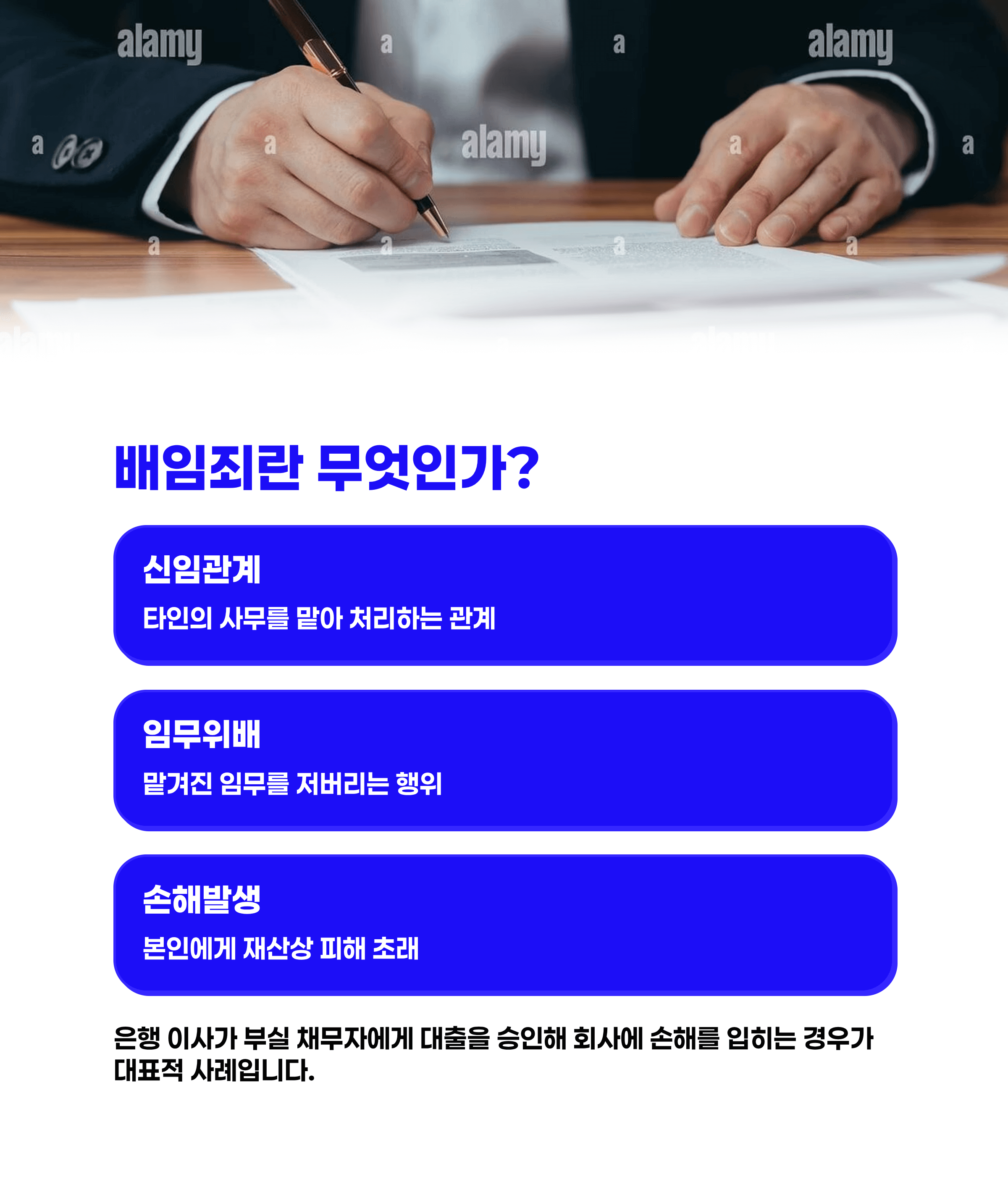 예를 들어, 은행 임원이 연체 위험을 알면서도 지인에게 대출을 집행해 손해를 입히는 경우도 배임죄로 처벌될 수 있습니다.