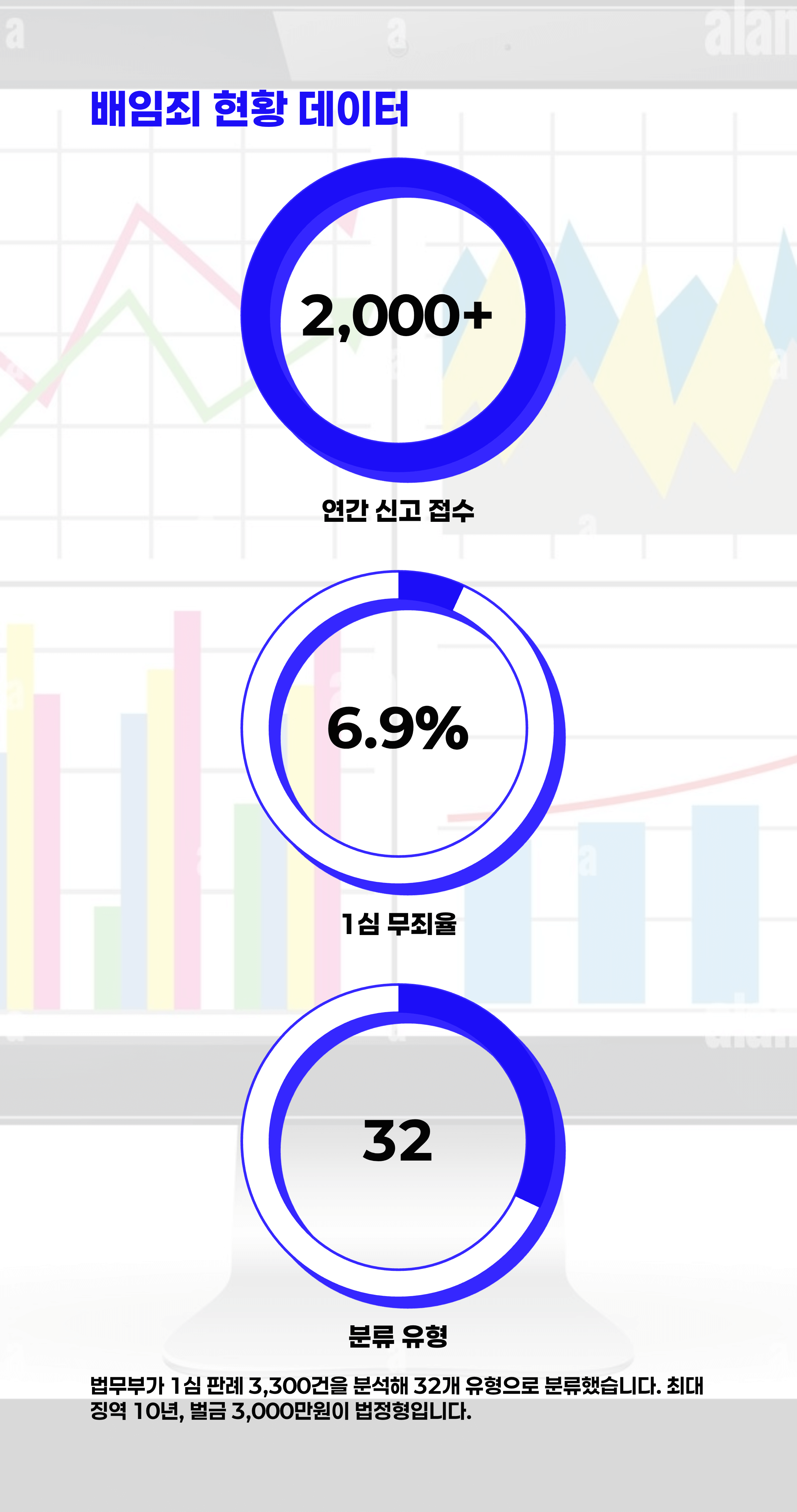 법무부와 대법원 자료에 따르면, 배임죄는 매년 약 2,000건 이상 기소되고 있으며, 2022~2025년 동안 1심 무죄율은 약 6.9%로, 일반 형사사건 평균(3.3%)의 두 배에 이릅니다.