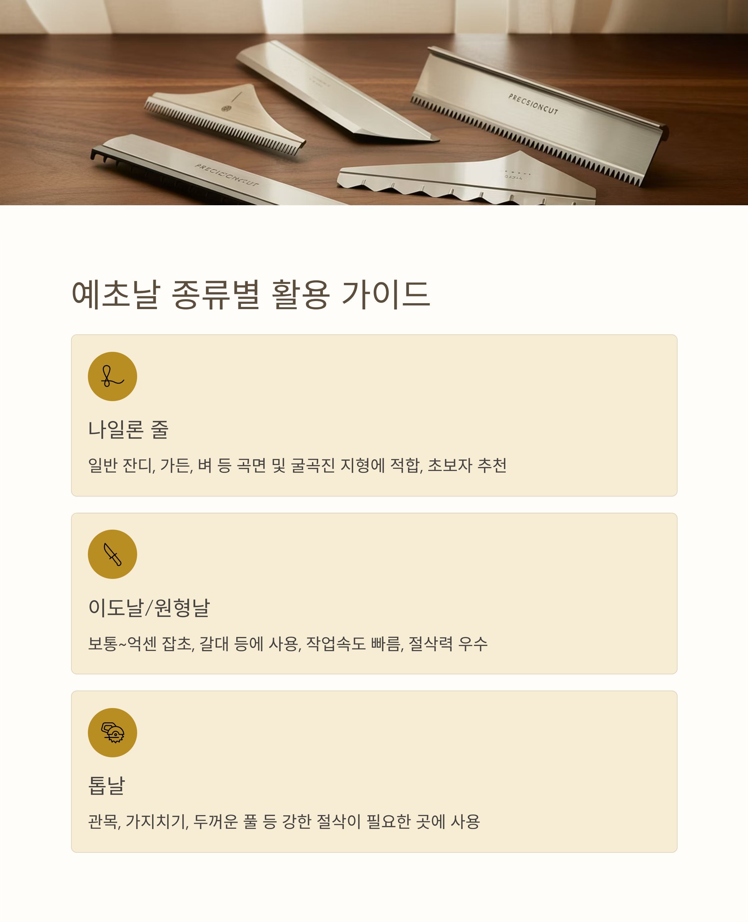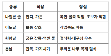 A4. 잡초는 이도날, 잔디는 나일론 줄, 잡목은 원형날, 관목은 톱날이 적합합니다.