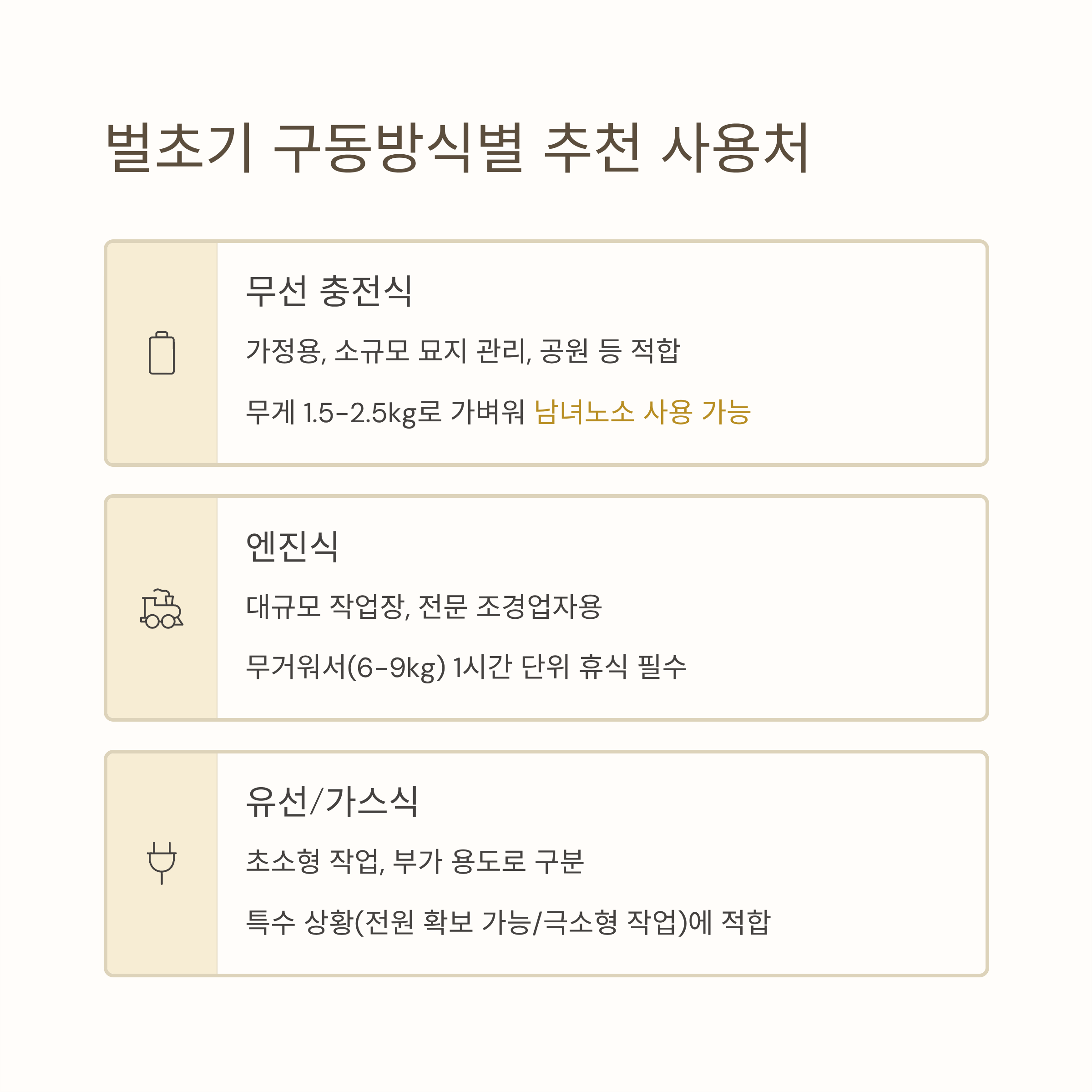 - ⛽ 연료식(엔진): 강력한 힘, 장시간 사용 가능(2~3시간). 전문가·대규모 벌초에 적합.
