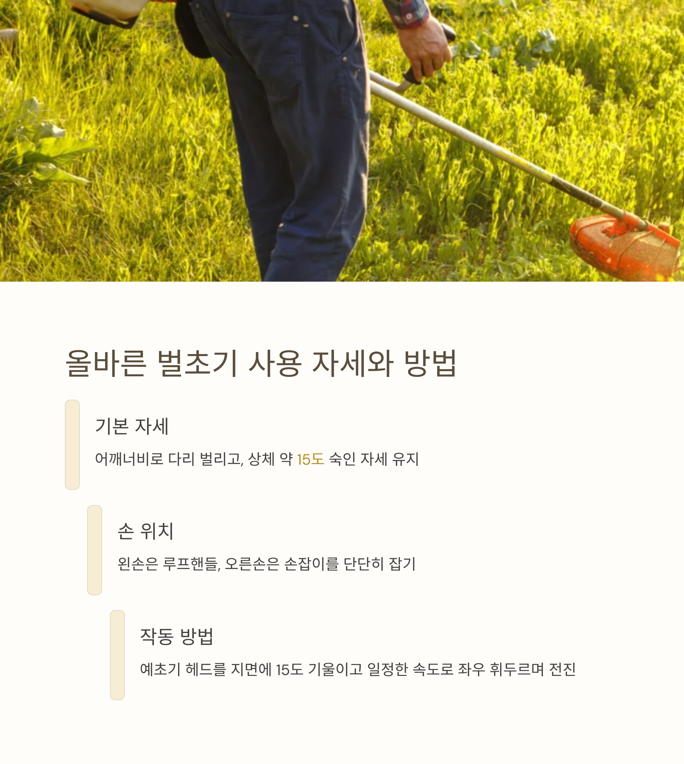- 상체 15도 숙여 예초기 헤드를 15도 기울여 작업